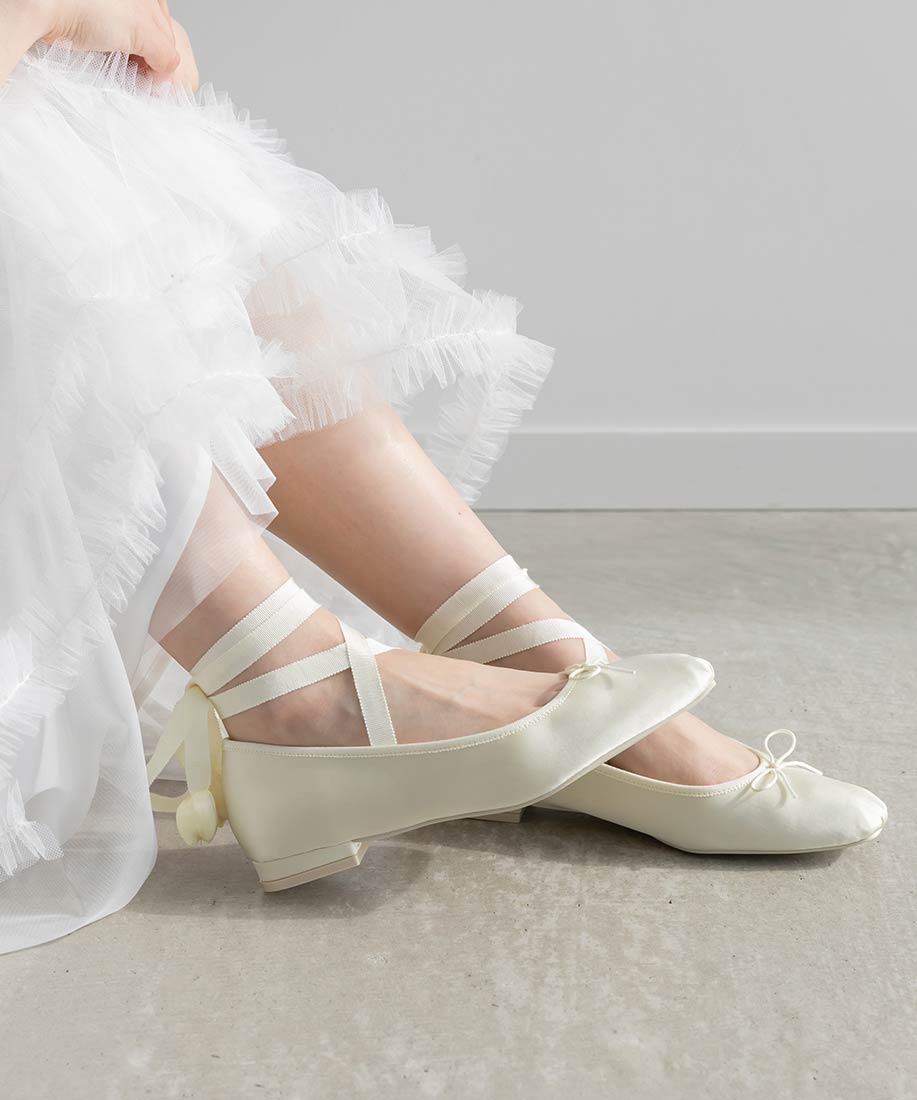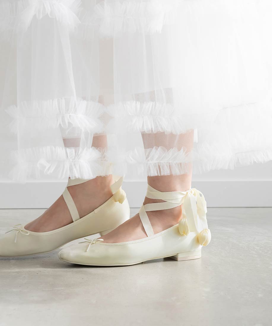 チューリップモチーフが印象的なレースアップバレエシューズ。