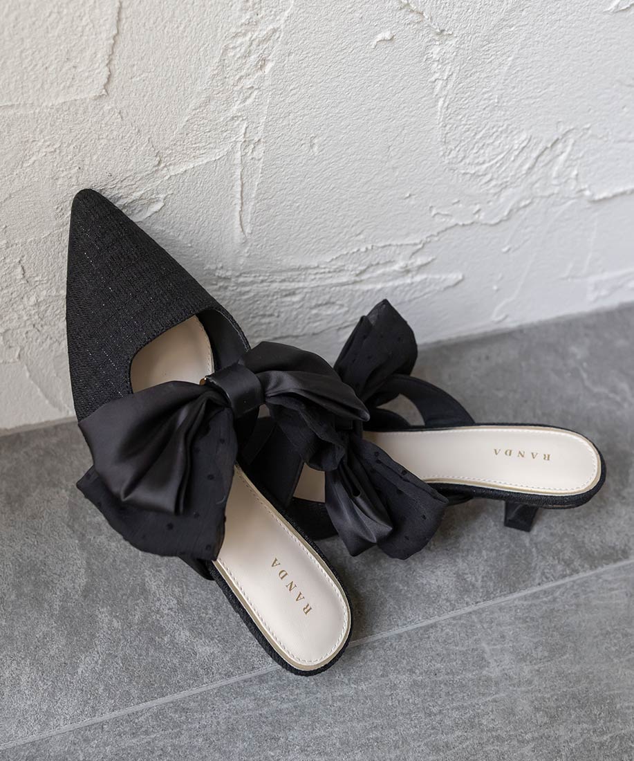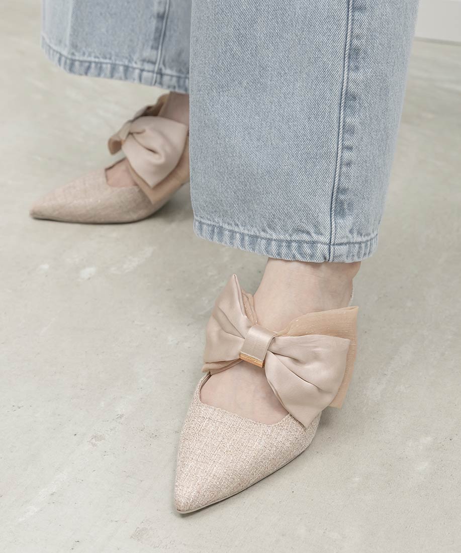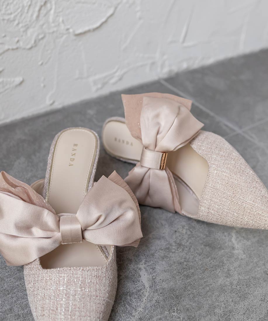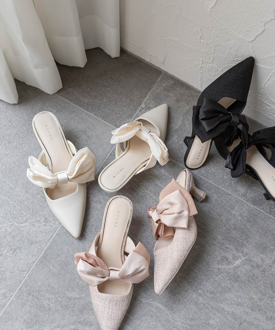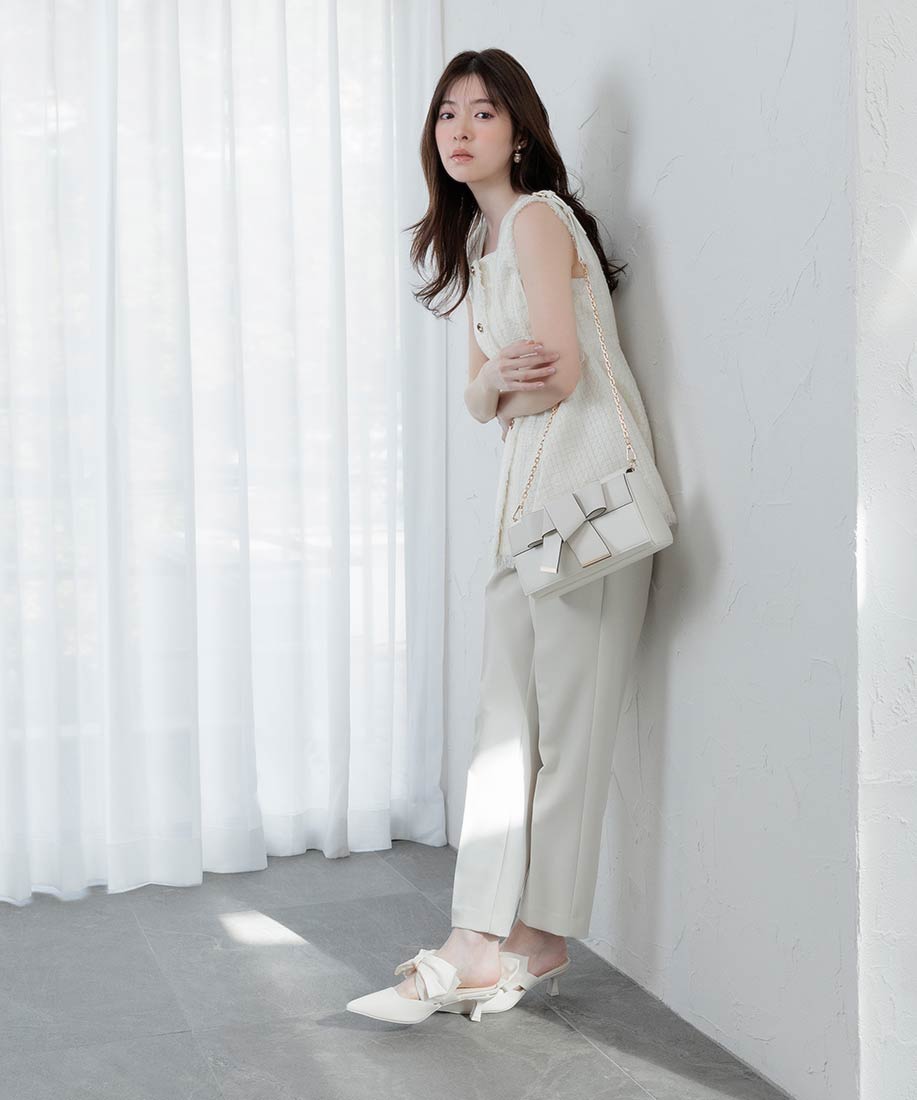 アイボリー⇒合成皮革(スムース)、サテン生地ピンク・ブラック⇒ツイード生地、サテン生地