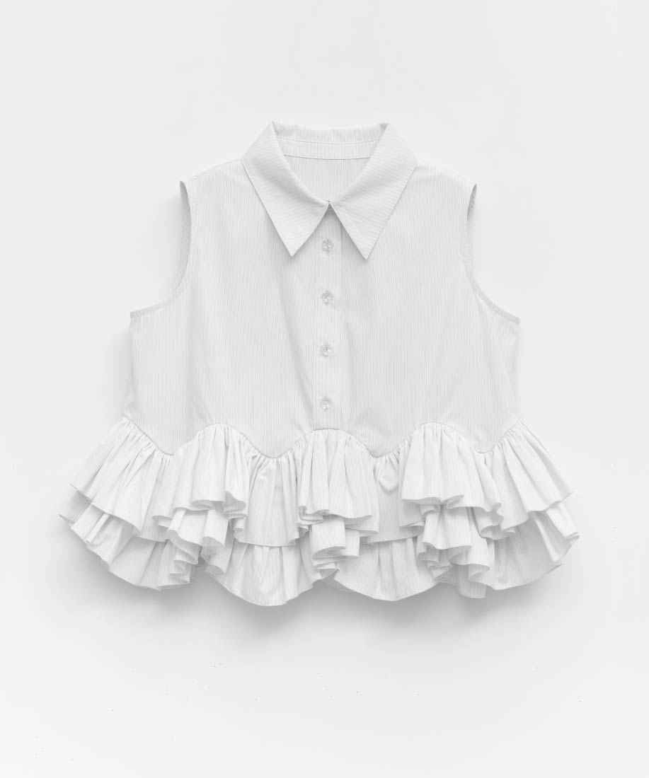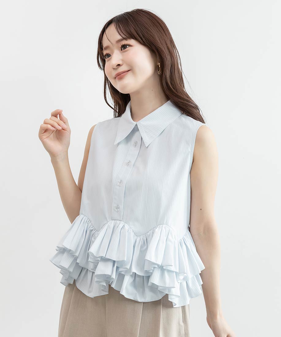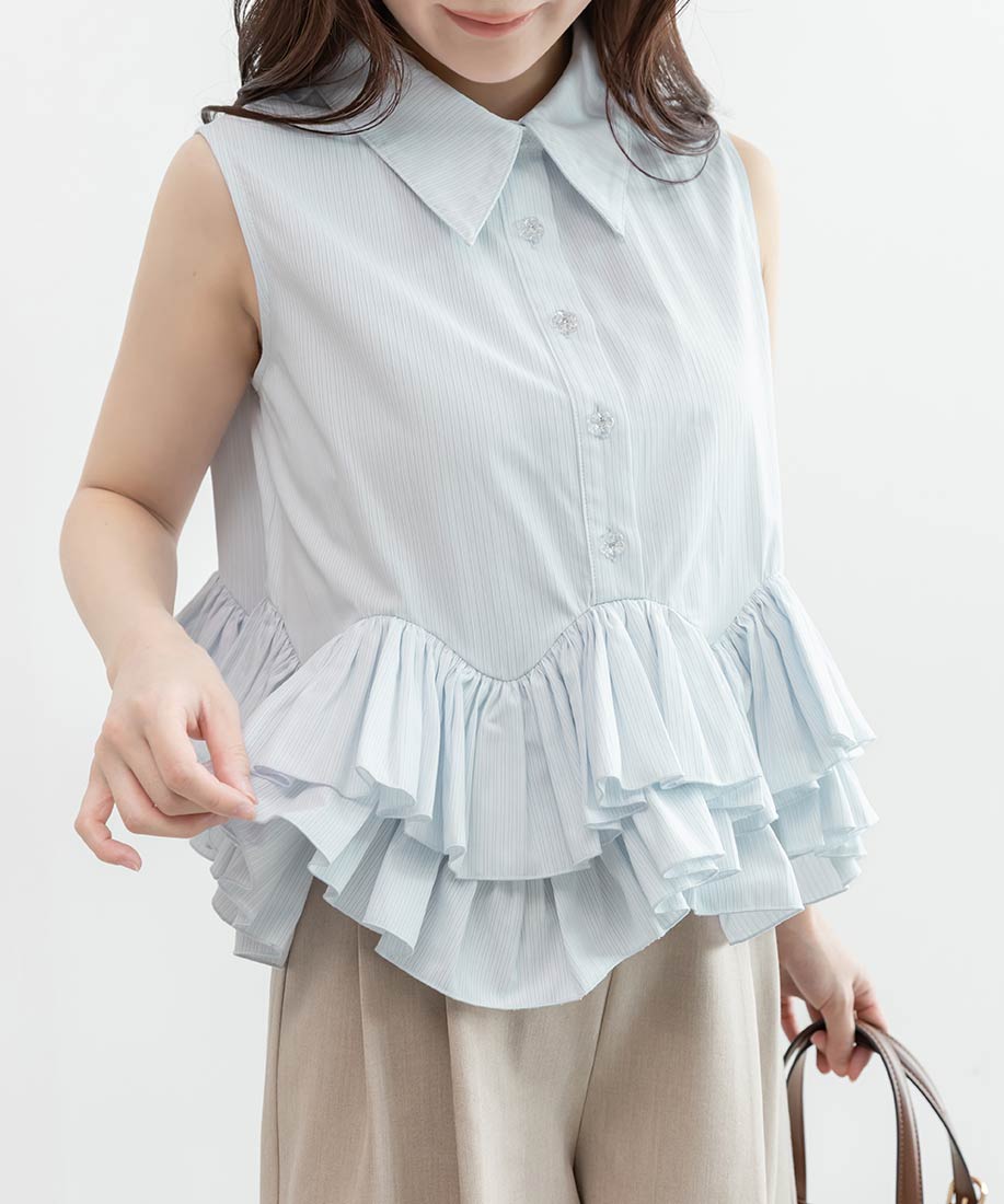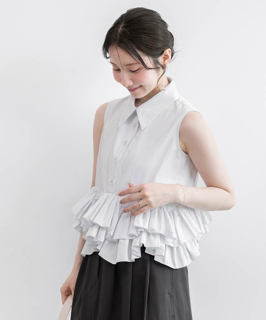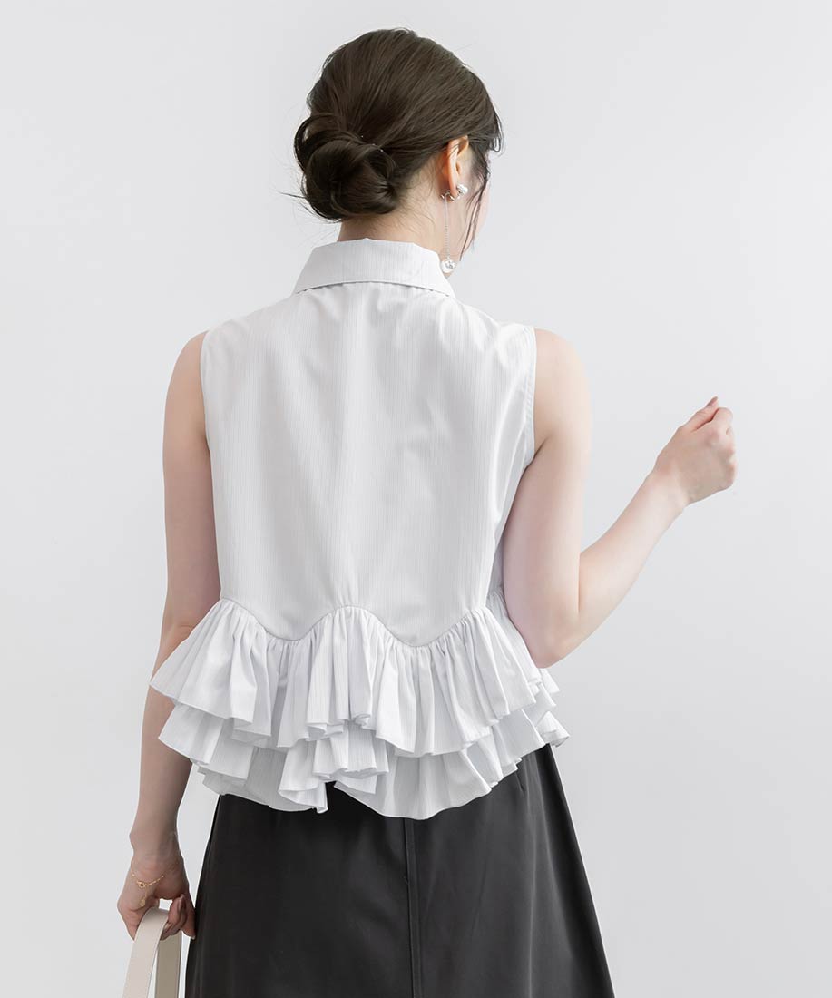 ・ボリューム感のあるフリルヘムデザインがアイコニックなノースリーブシャツブラウス