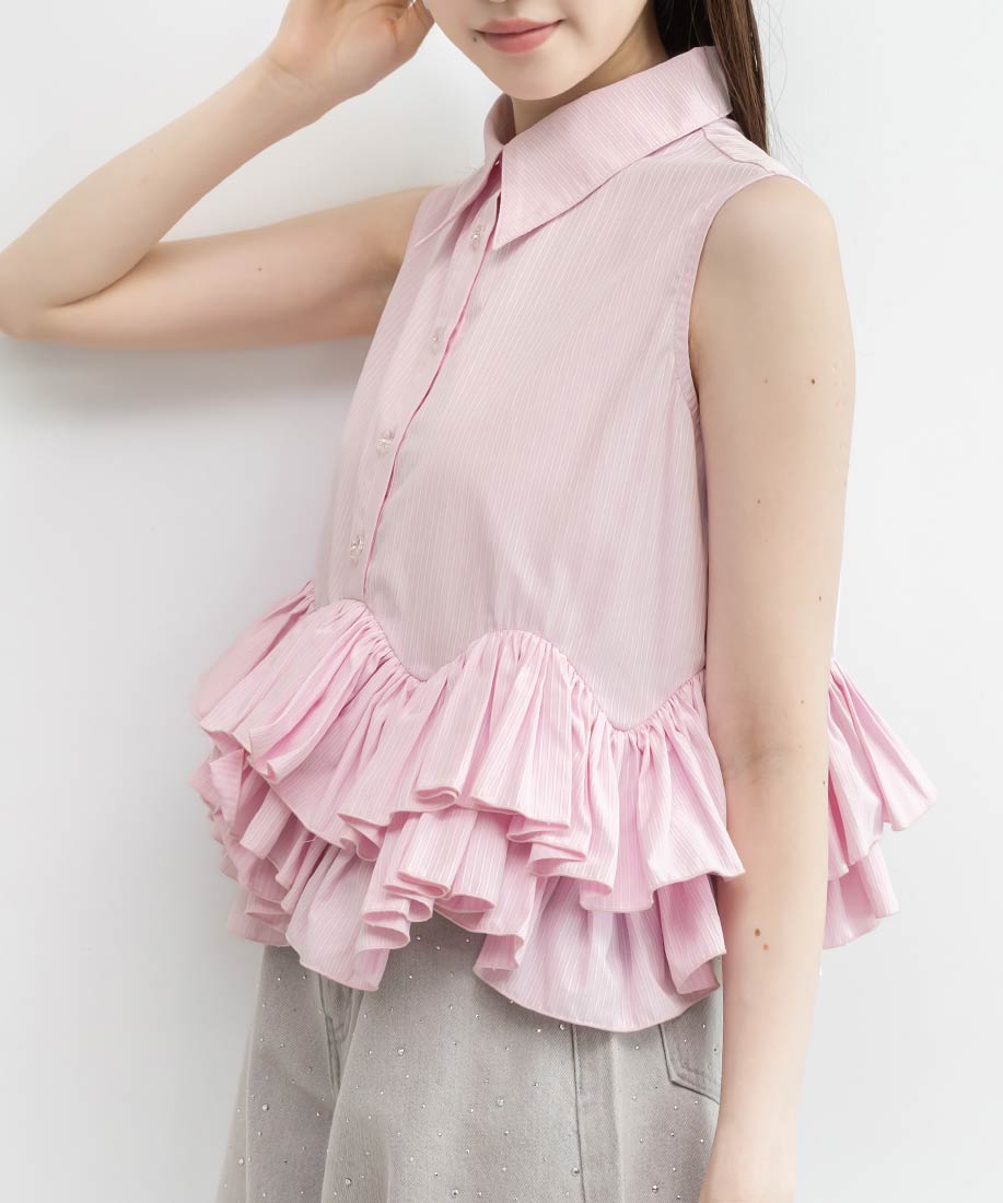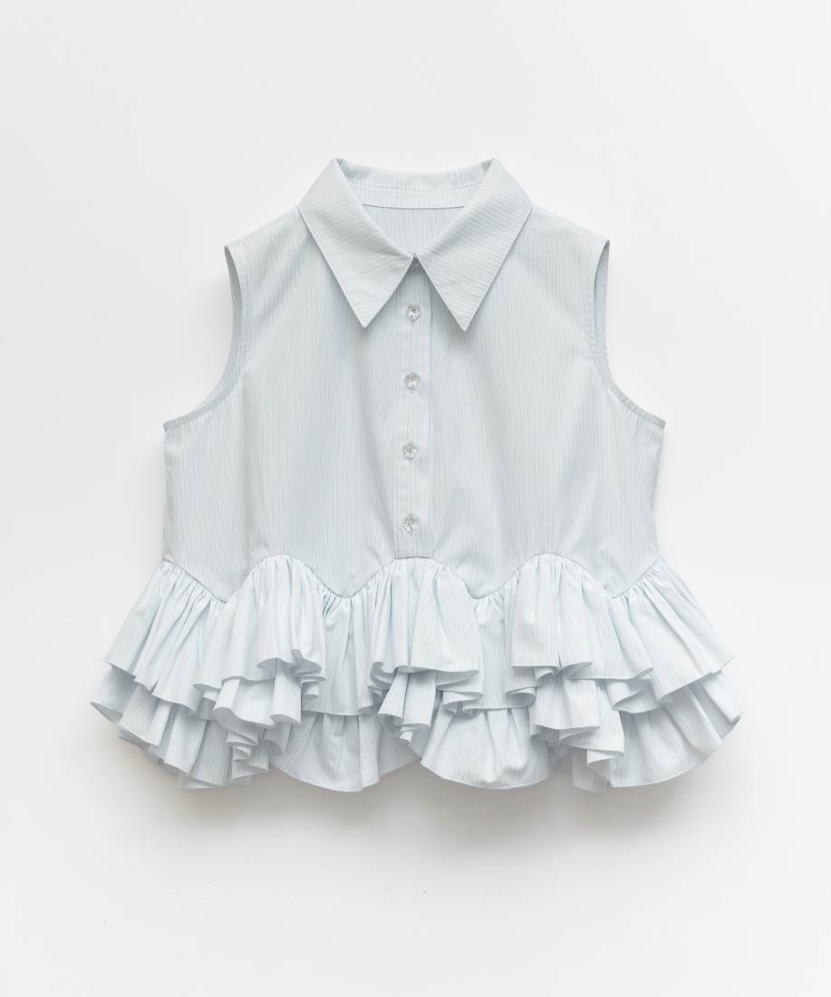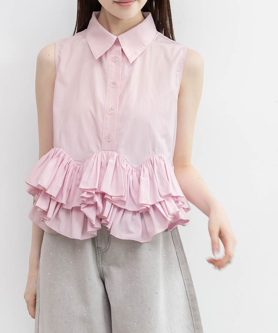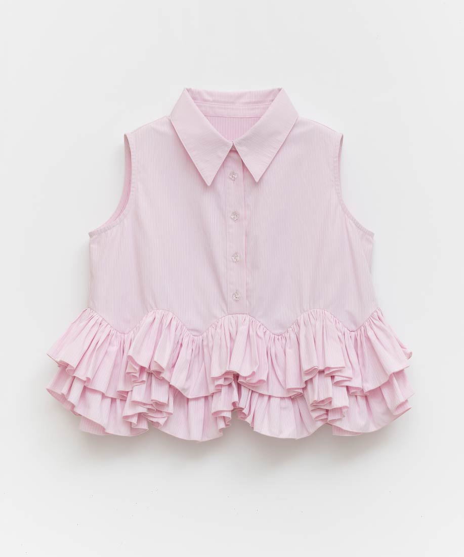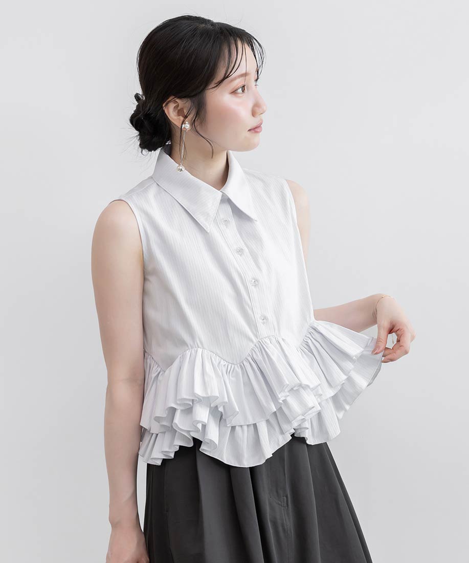 ・ボリューム感のあるフリルヘムデザインがアイコニックなノースリーブシャツブラウス
