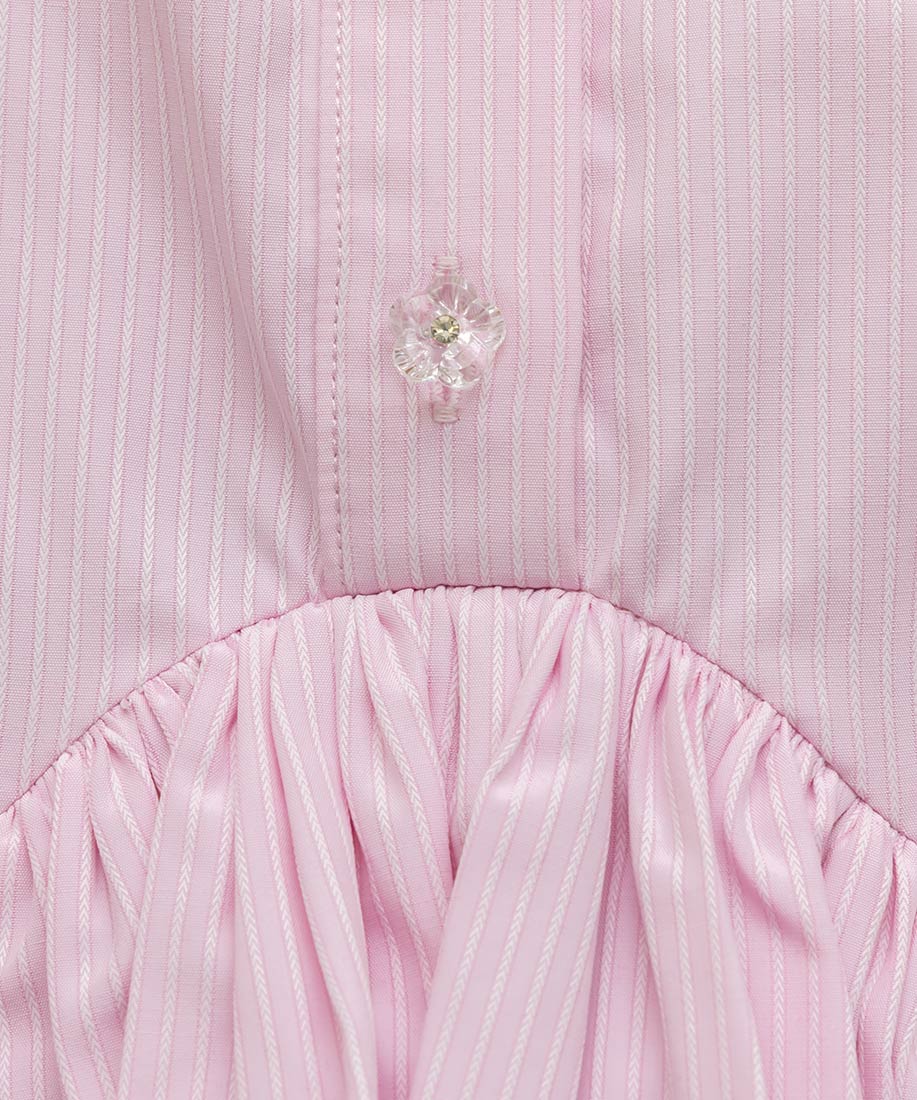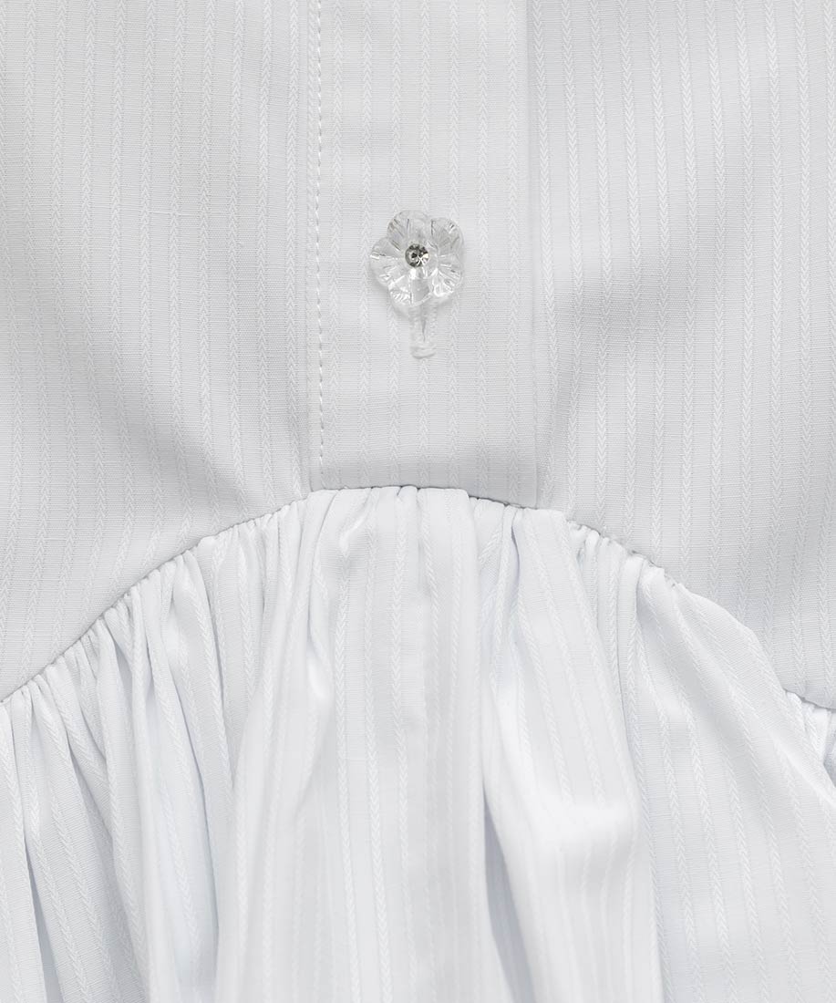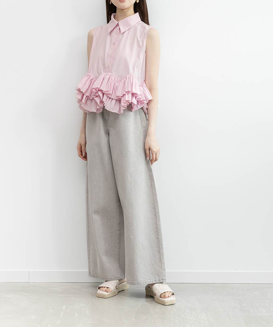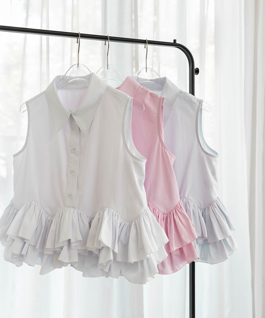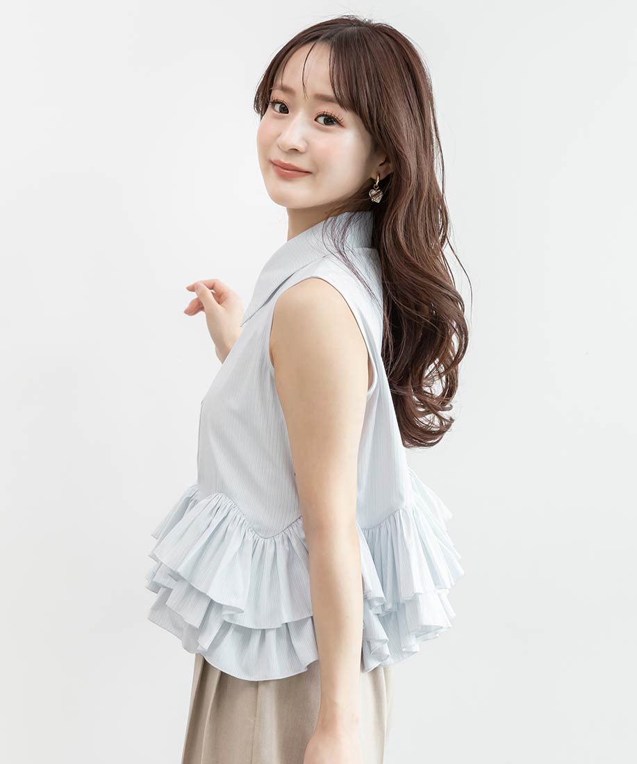・ボリューム感のあるフリルヘムデザインがアイコニックなノースリーブシャツブラウス
