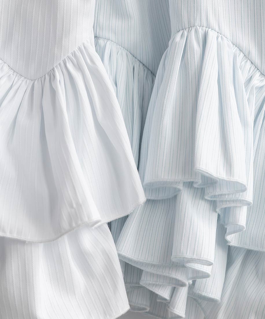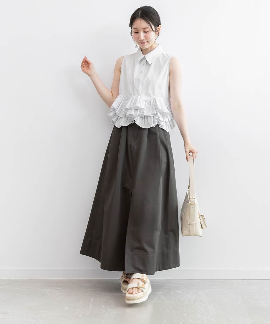 ノースリーブデザインですっきりと抜け感をプラスしつつ、ボリュームたっぷりのフリルでシルエットのコントラストを楽しめる一枚です。