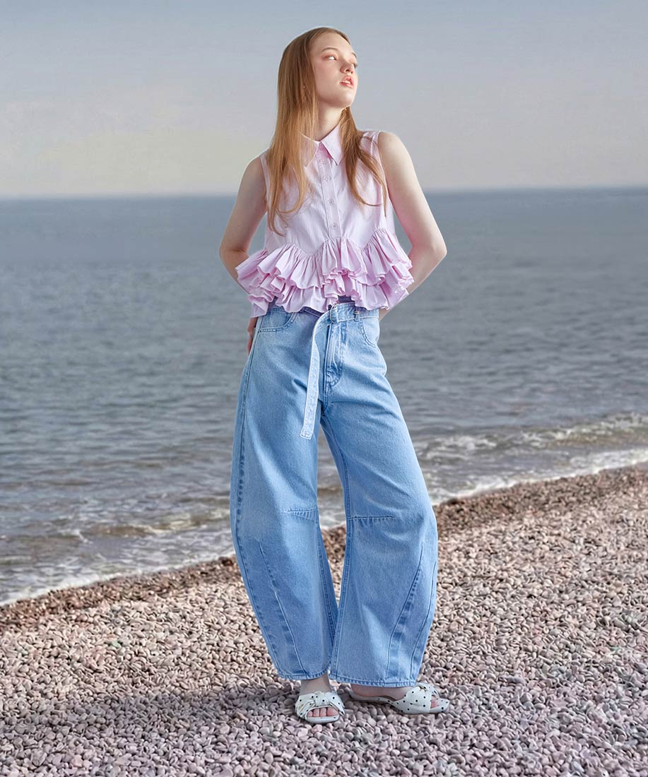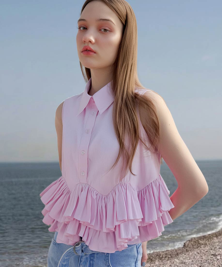・ボリューム感のあるフリルヘムデザインがアイコニックなノースリーブシャツブラウス
