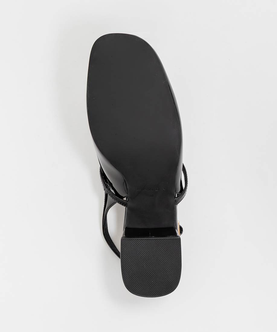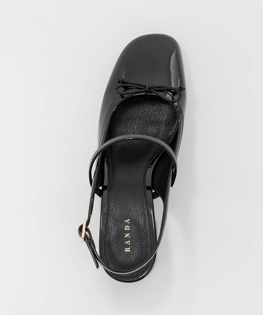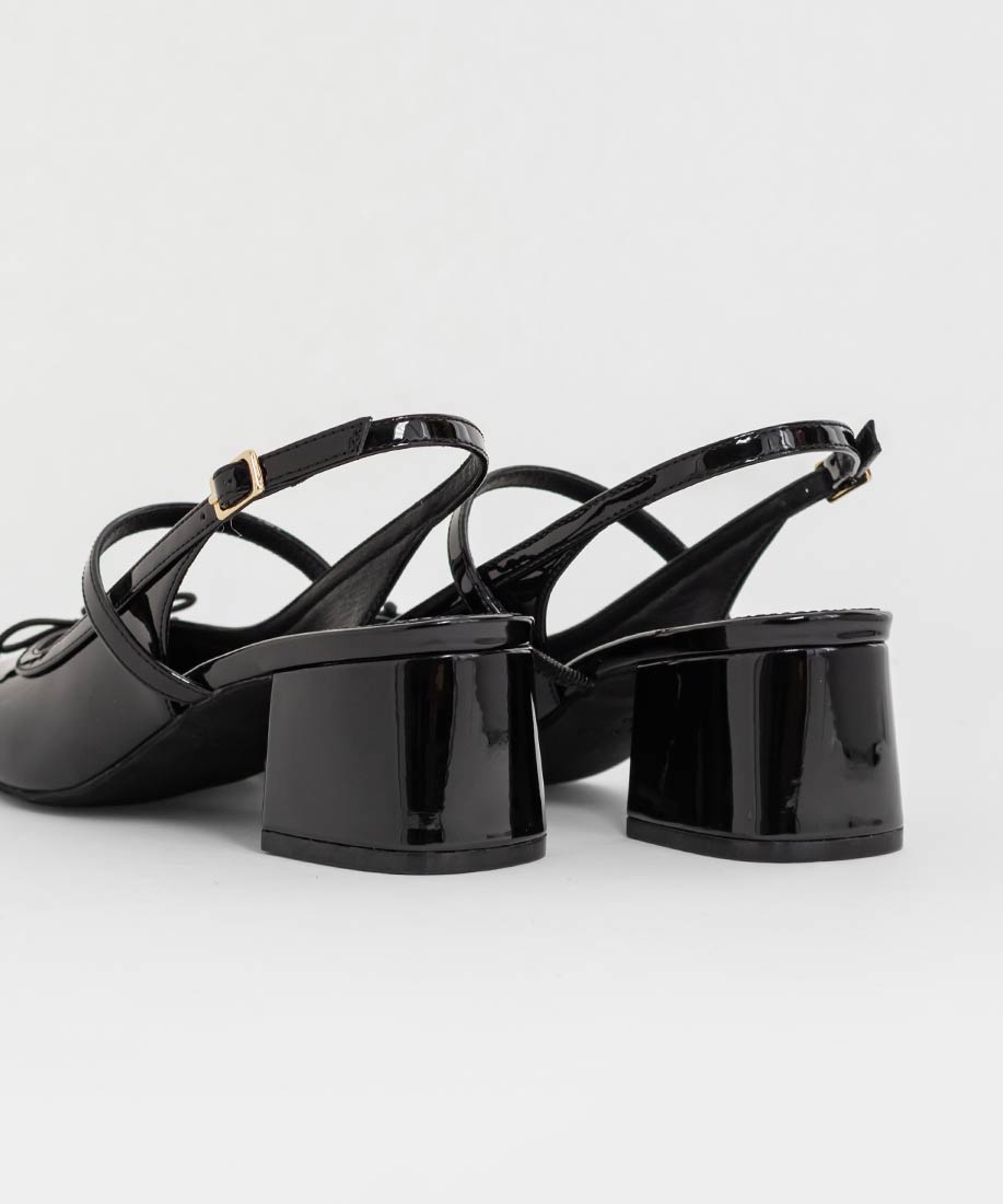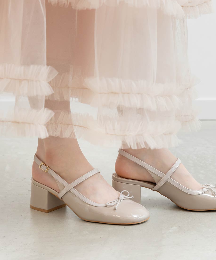 艶やかなエナメル素材がエレガントな印象のバックストラップパンプス。