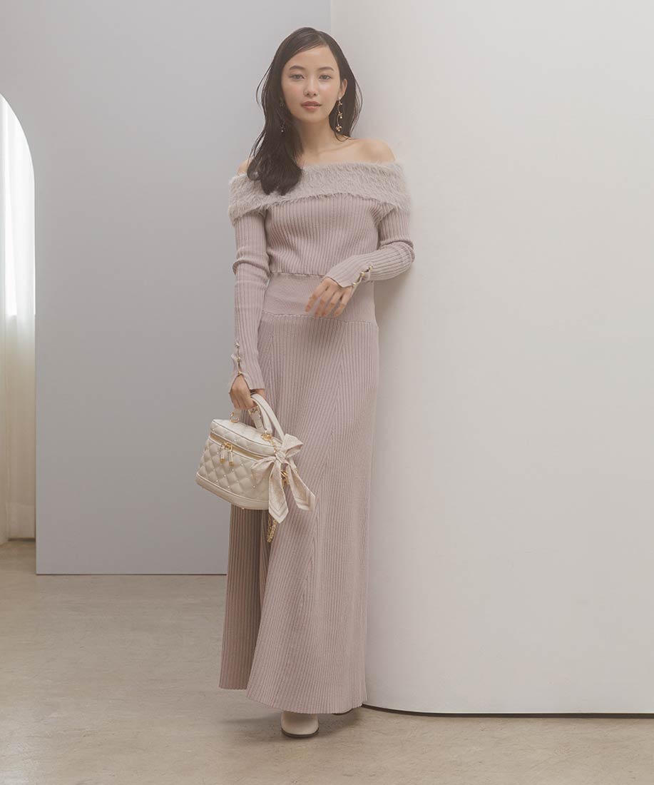 ふわふわのシャギーカラーで顔周りを華やかに魅せるオフショルダーニットワンピース。