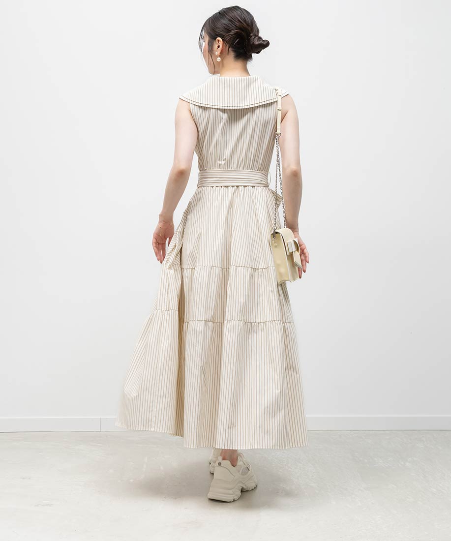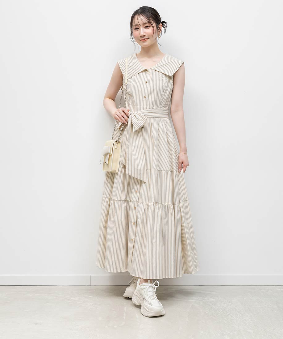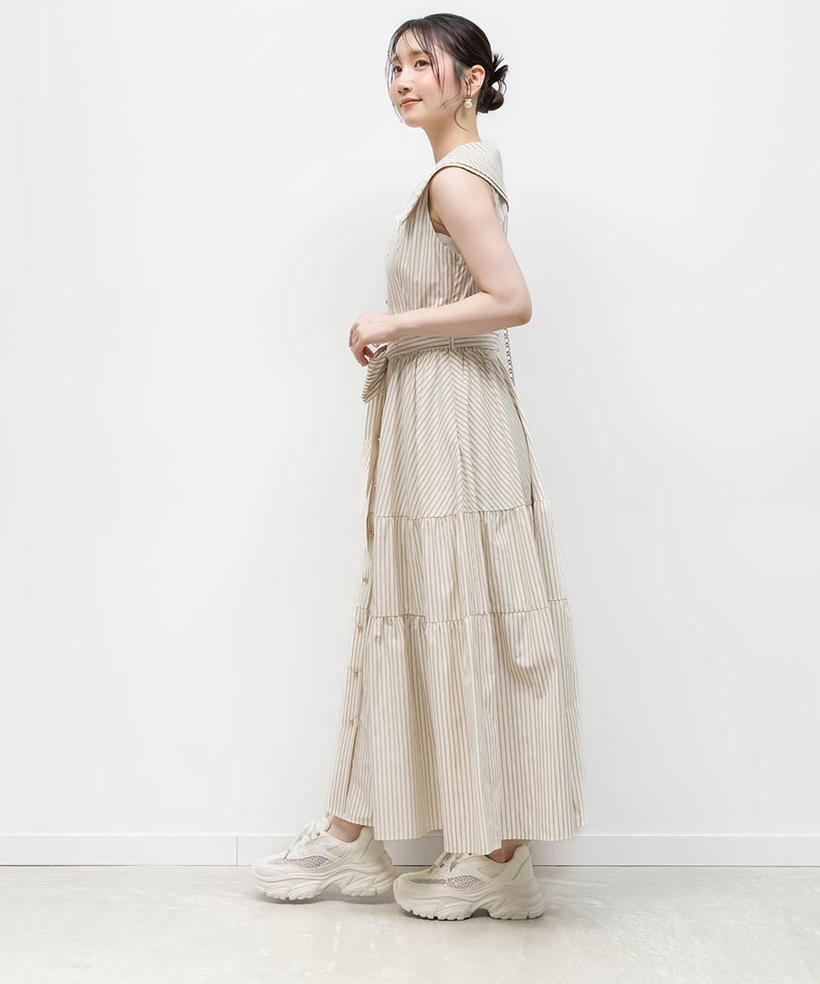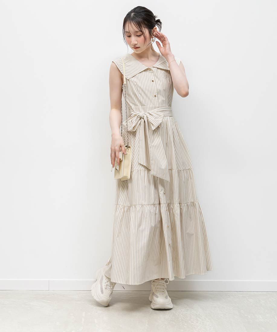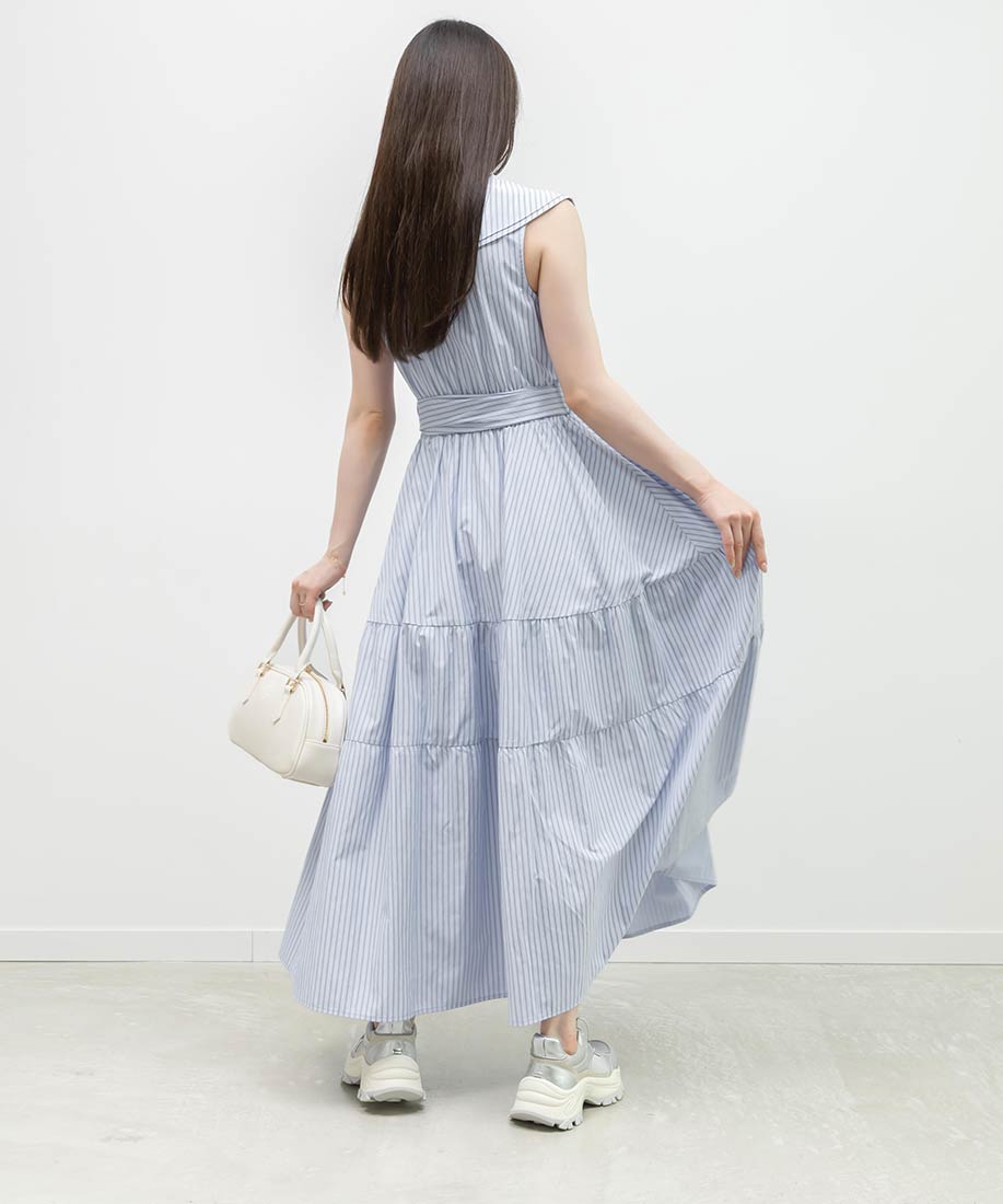 ストライプシャツ生地にティアードデザインを重ね、きちんと感と華やかさを兼ね備えたシャツワンピース。
