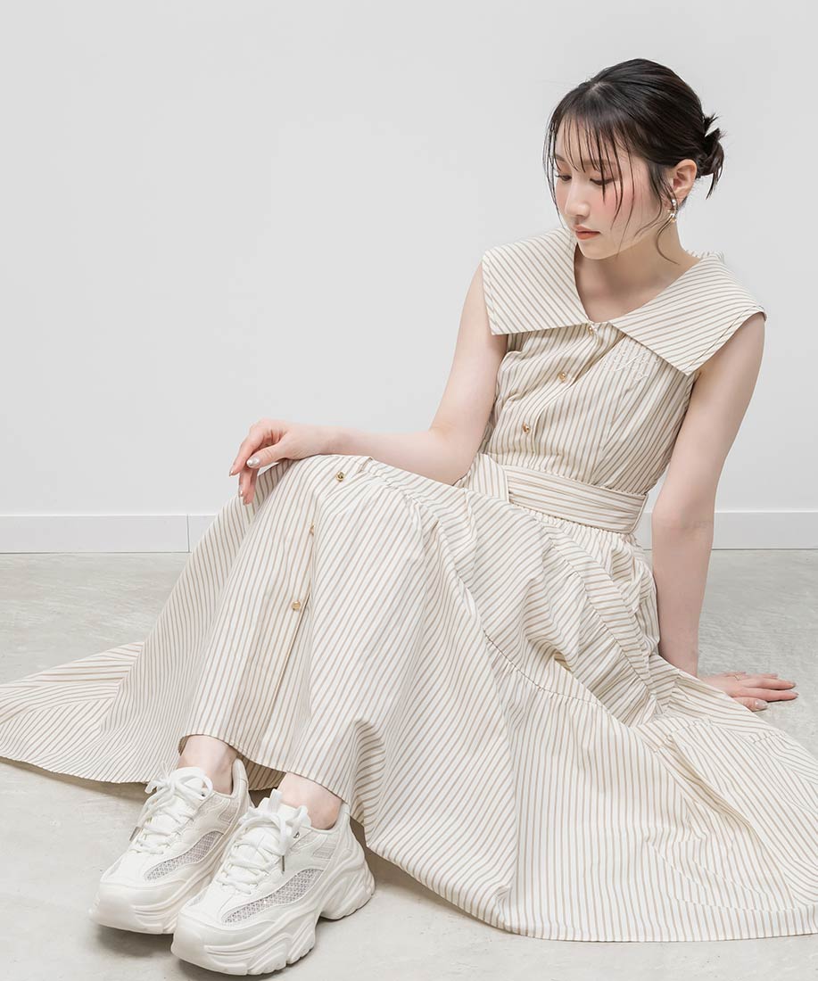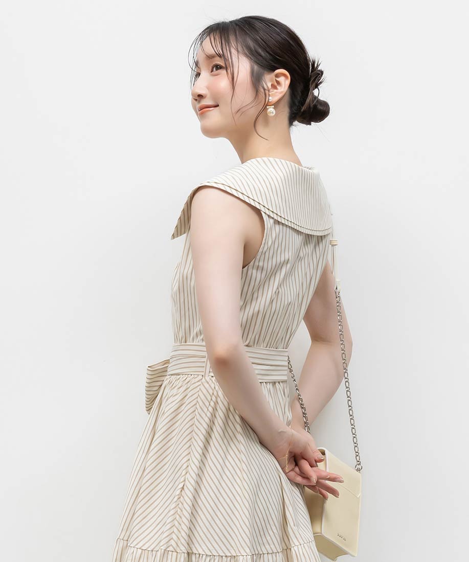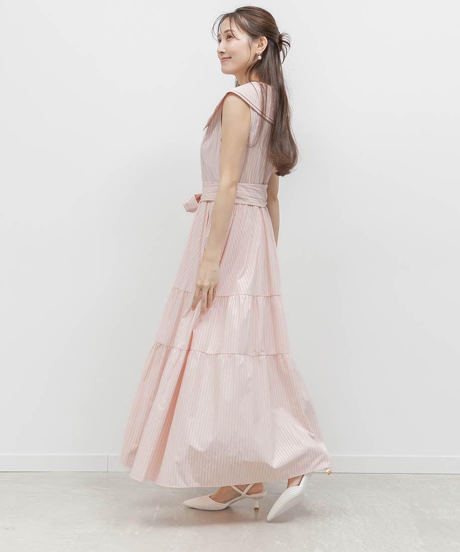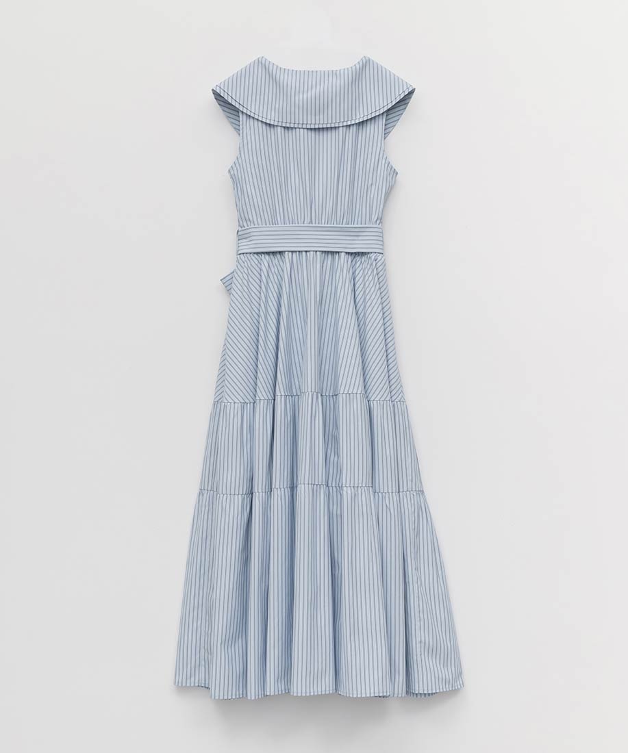 ストライプシャツ生地にティアードデザインを重ね、きちんと感と華やかさを兼ね備えたシャツワンピース。