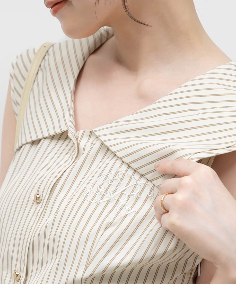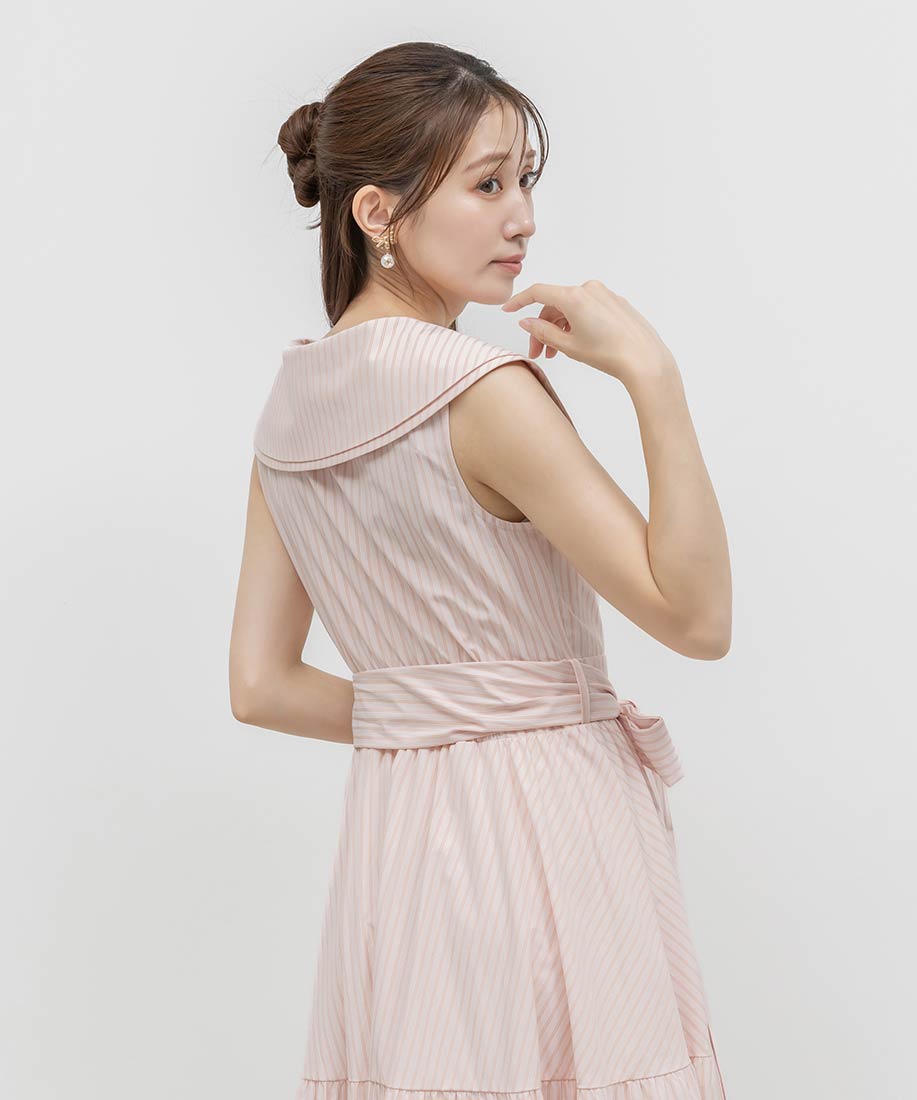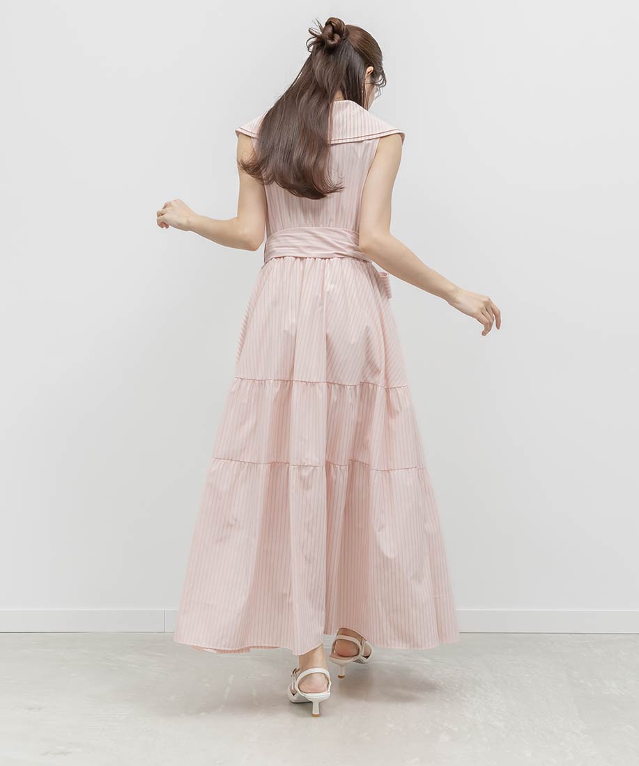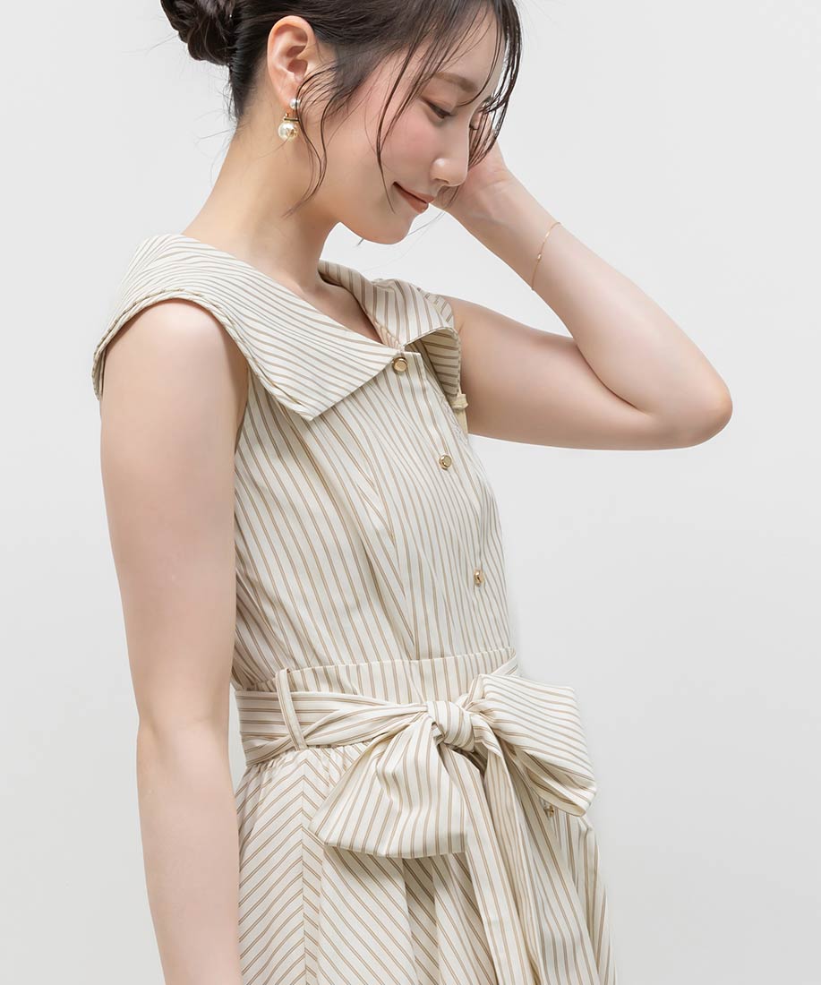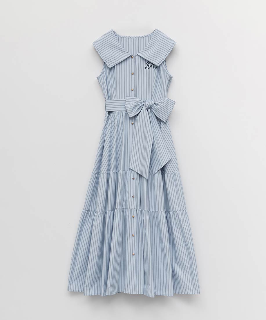 ストライプシャツ生地にティアードデザインを重ね、きちんと感と華やかさを兼ね備えたシャツワンピース。