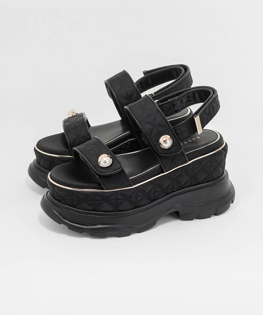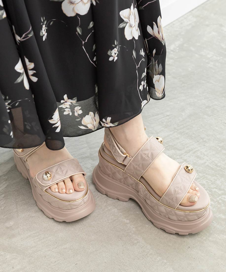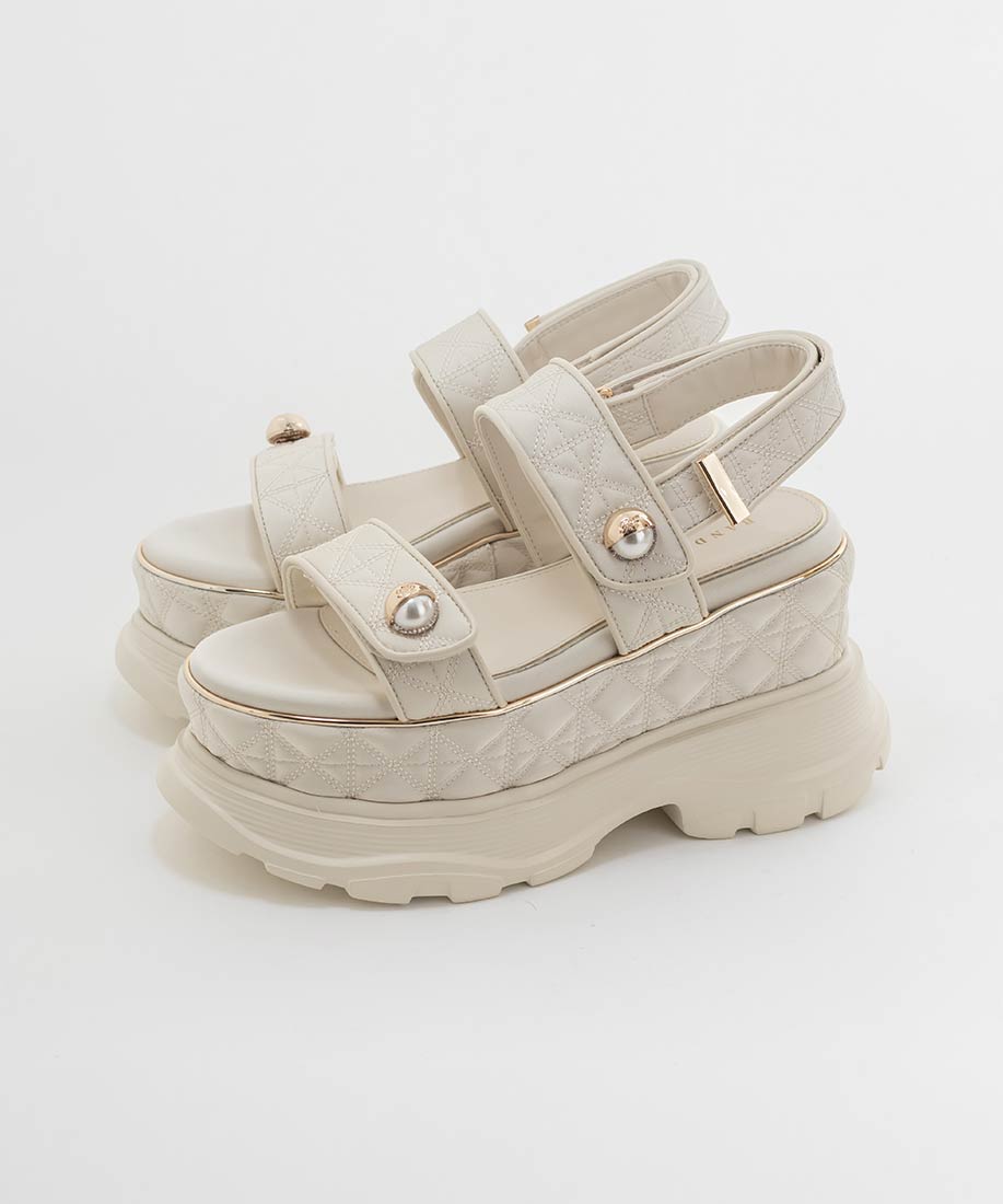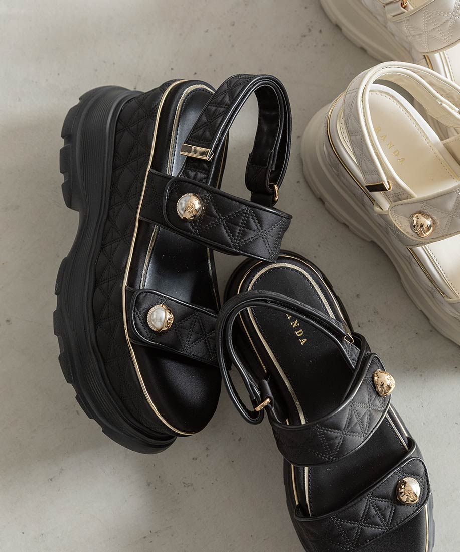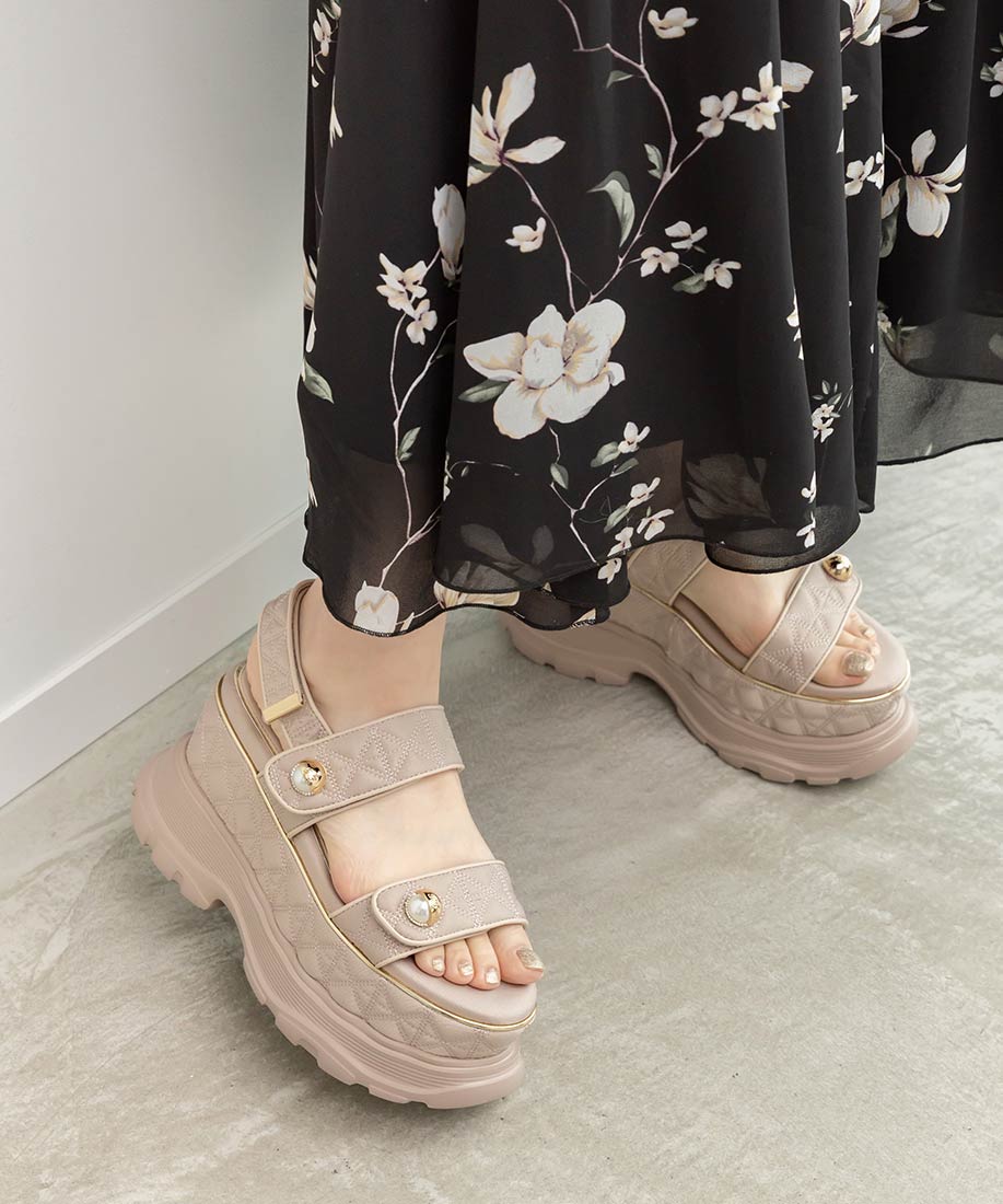 キルティング生地にオリジナルのパールパーツが映える、ボリュームソールのスポーツサンダル。