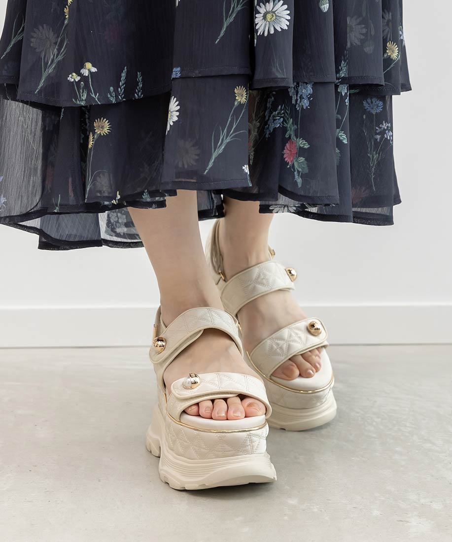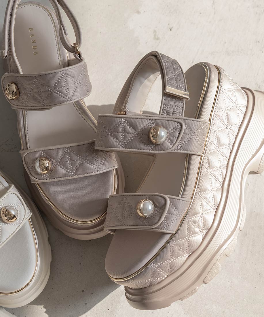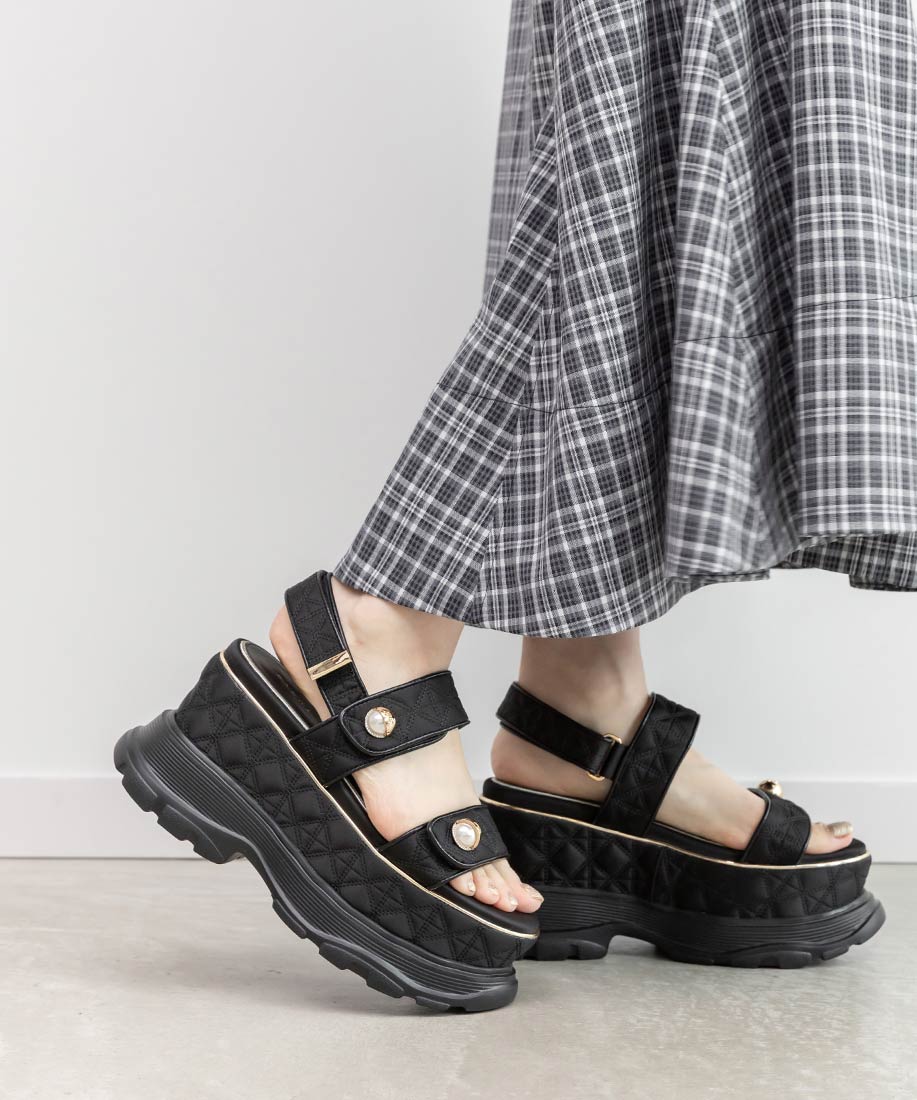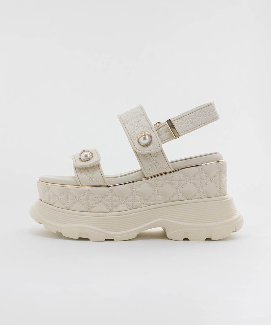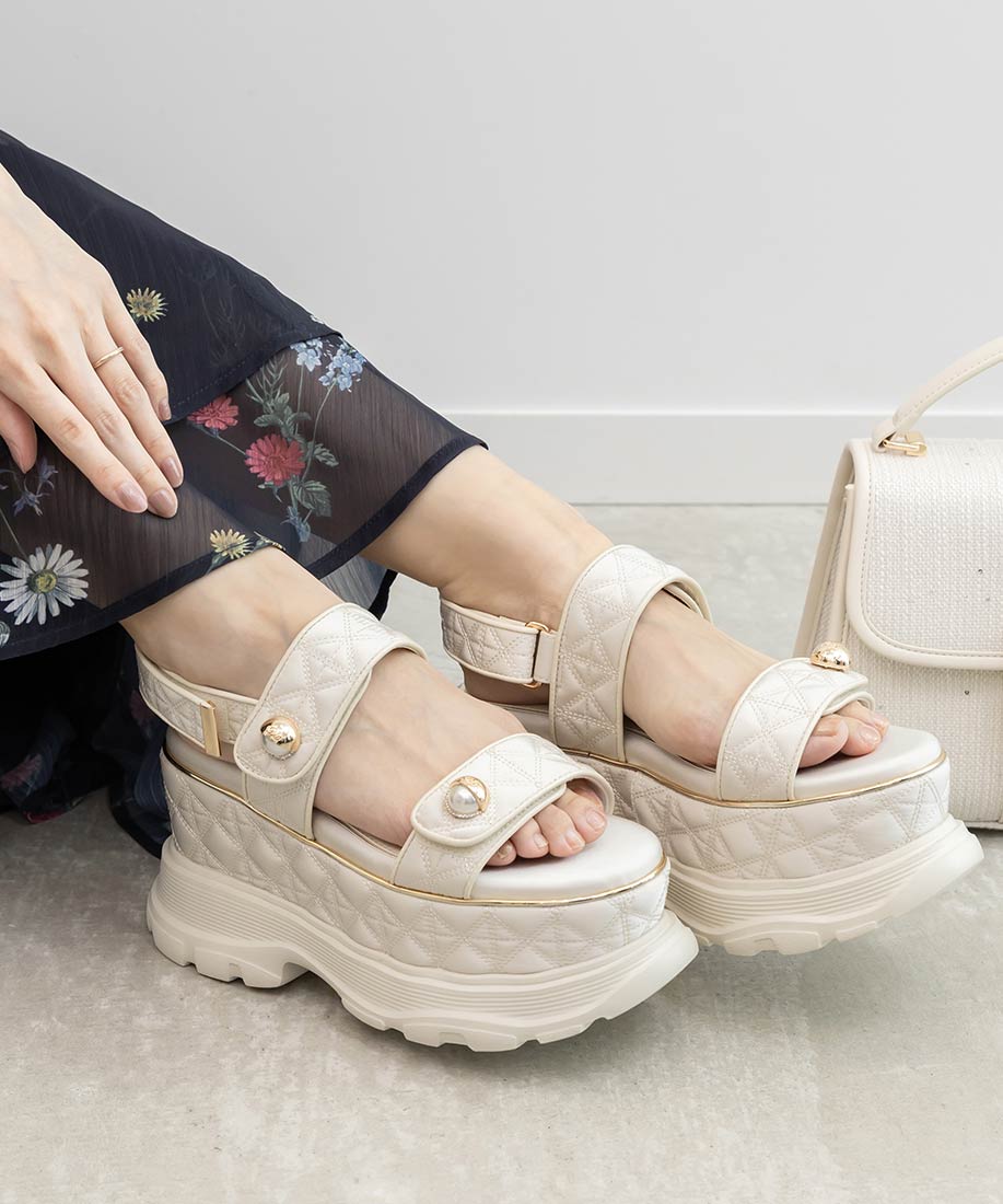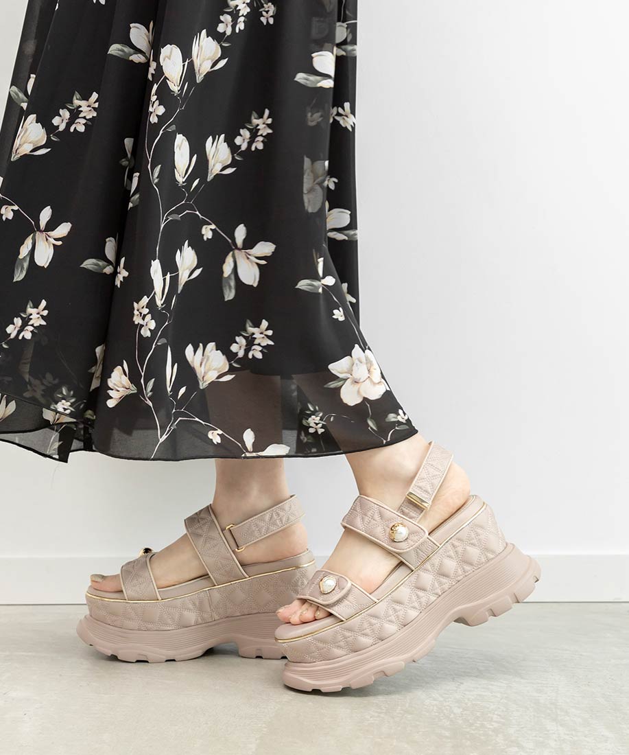 キルティング生地にオリジナルのパールパーツが映える、ボリュームソールのスポーツサンダル。
