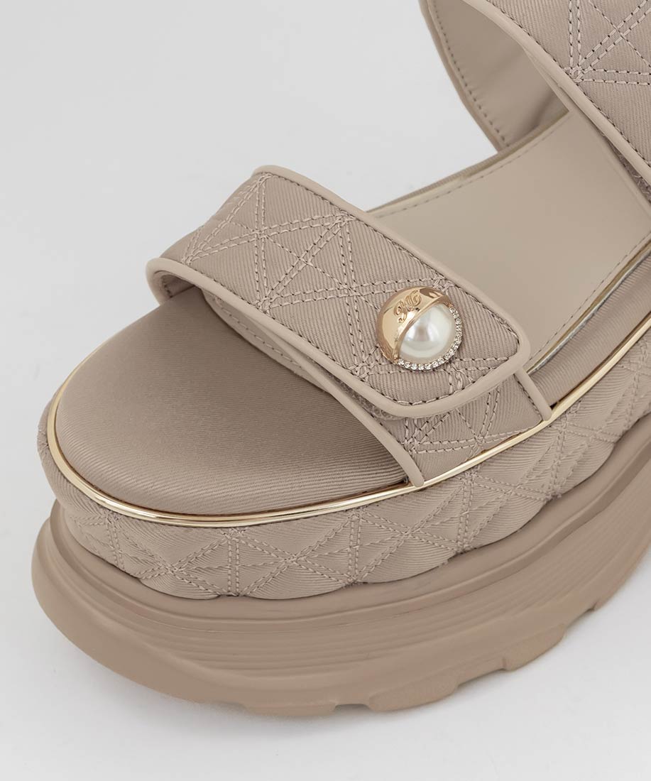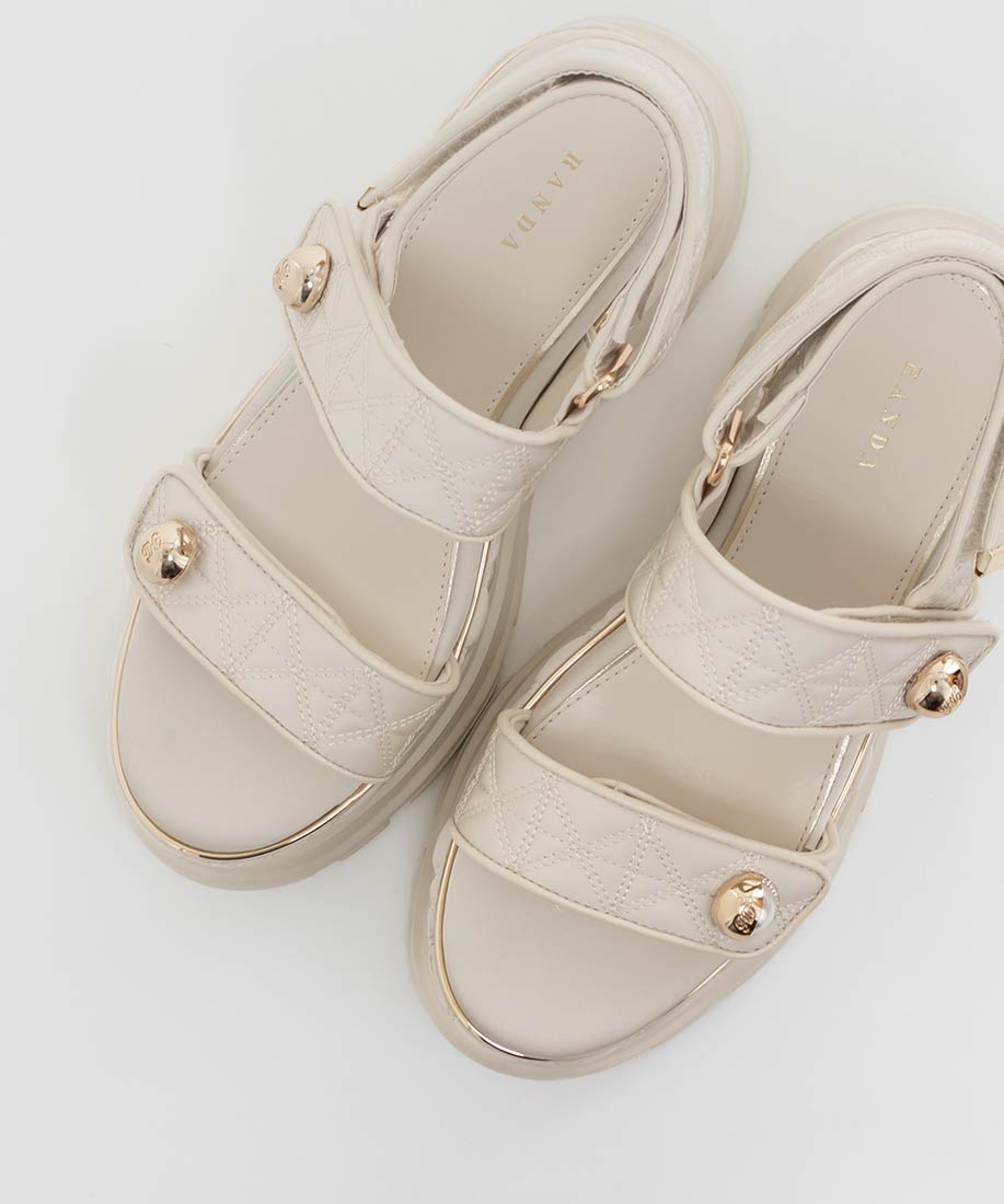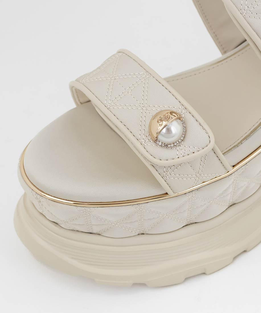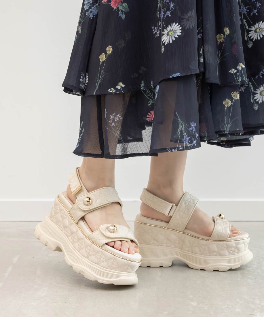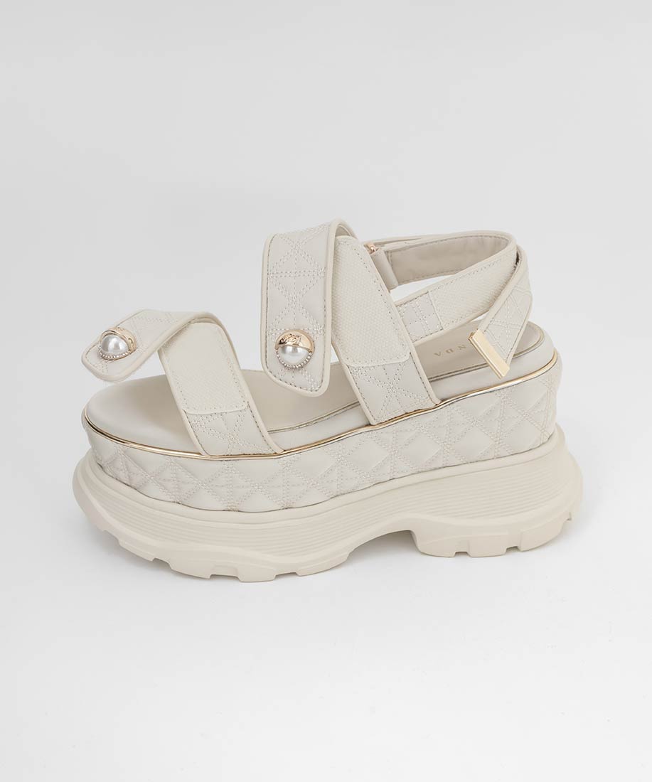 キルティング生地にオリジナルのパールパーツが映える、ボリュームソールのスポーツサンダル。