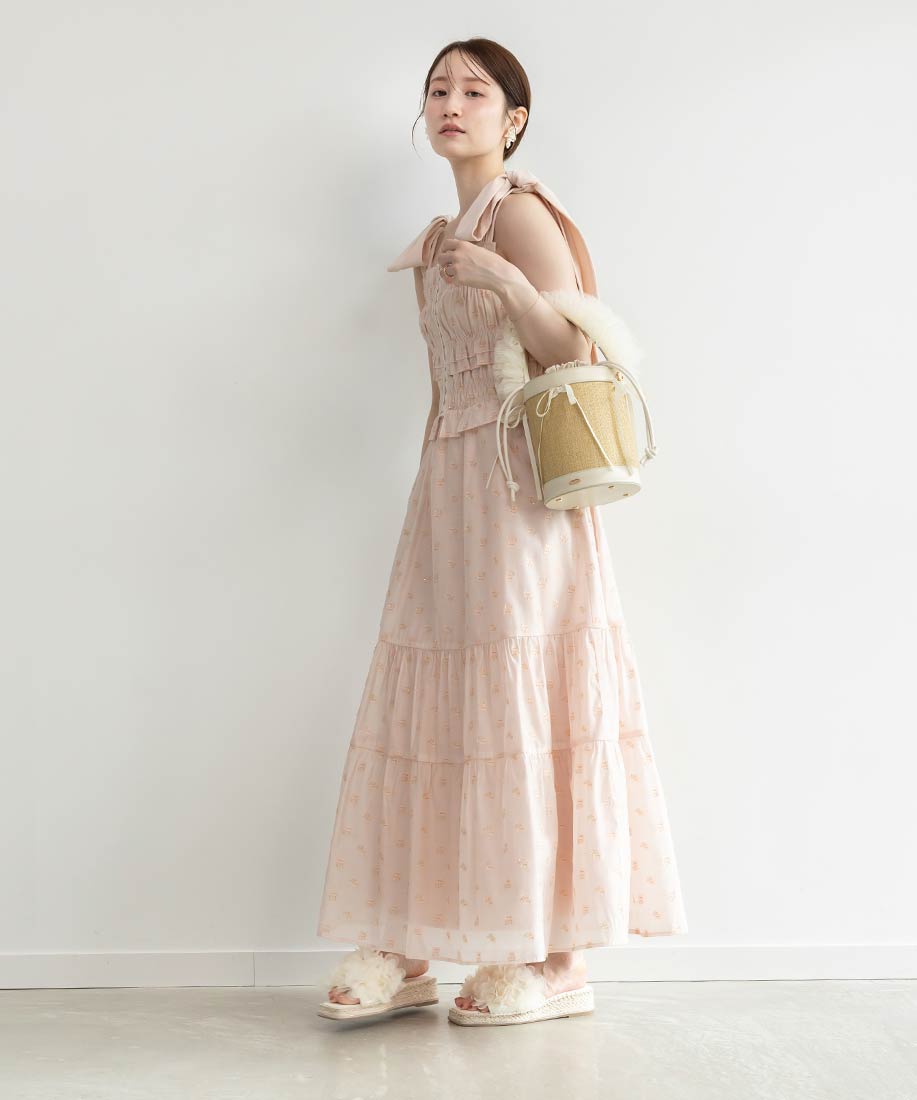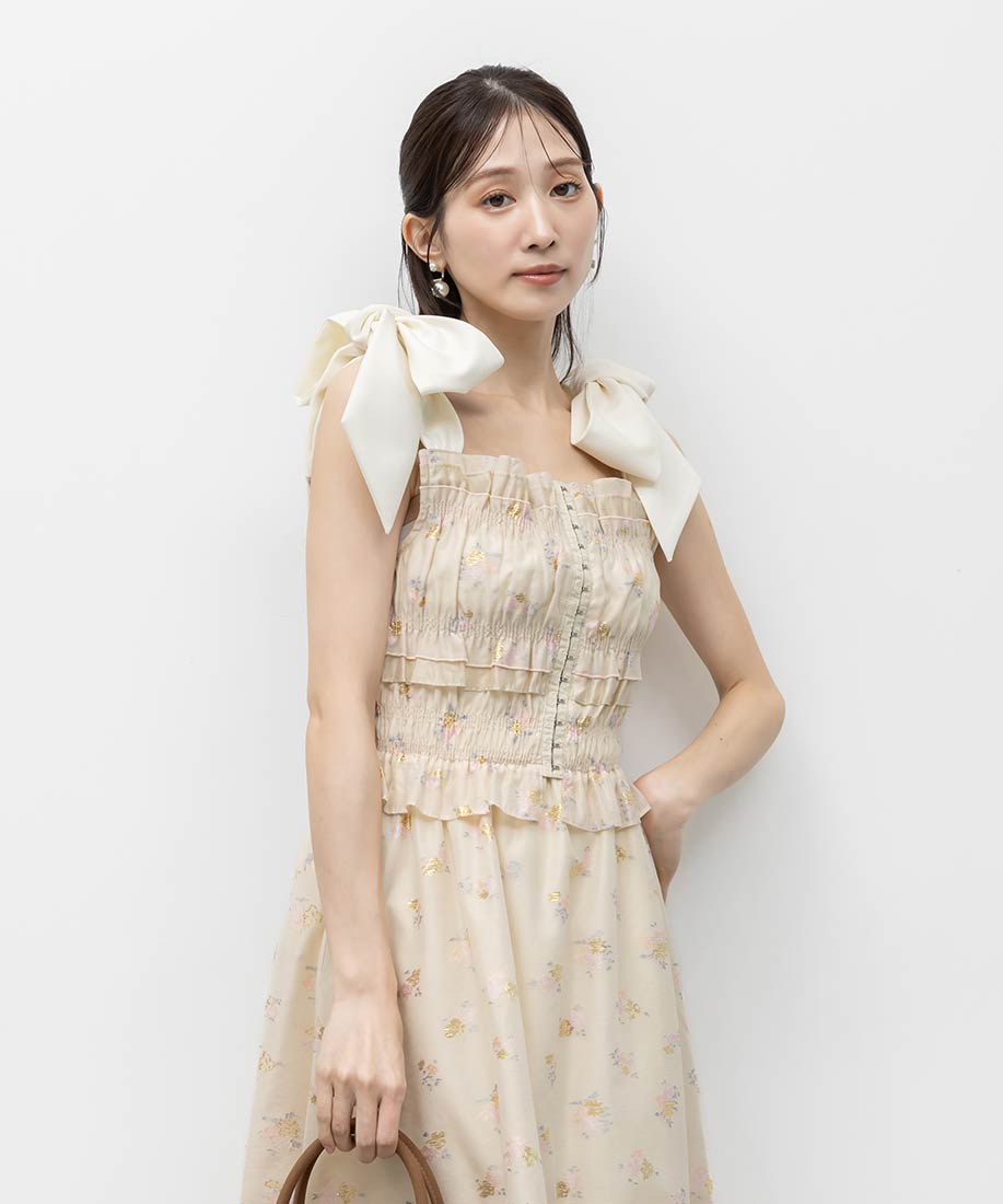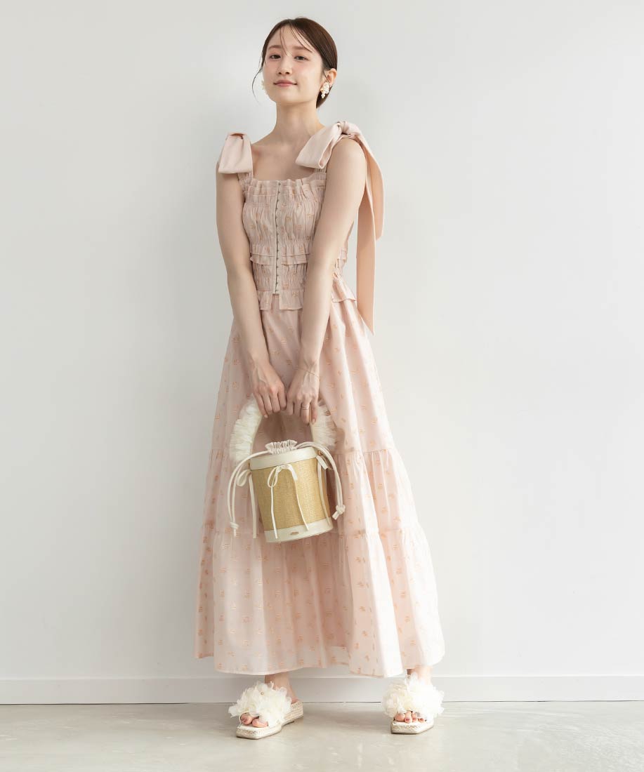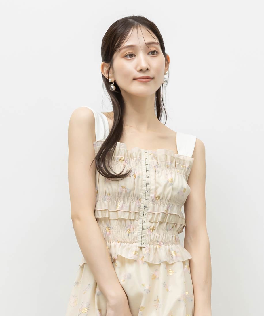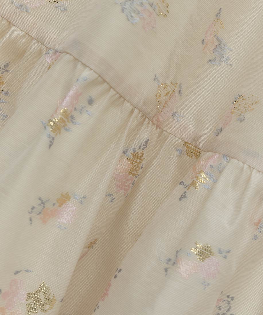 ブラック・ホワイト⇒(表地)ポリエステル100%(別布)ポリエステル75%・レーヨン20%・ポリウレタン5%(裏地)身頃⇒ポリエステル100%、スカート⇒ポリエステル95%・ポリウレタン5%ピンク⇒(表地)レーヨン50%・ナイロン26%・ポリエステル24%(スリット糸使用)(別布)レーヨン70%・ナイロン30%(裏地)身頃⇒ポリエステル100%、スカート⇒ポリエステル95%・ポリウレタン5%ベージュ⇒(表地)レーヨン60%・ポリエステル25%・ナイロン15%(スリット糸使用)(別布)ポリエステル78%・レーヨン16%・ポリウレタン6%(裏地)ポリエステル95%、ポリウレタン5%