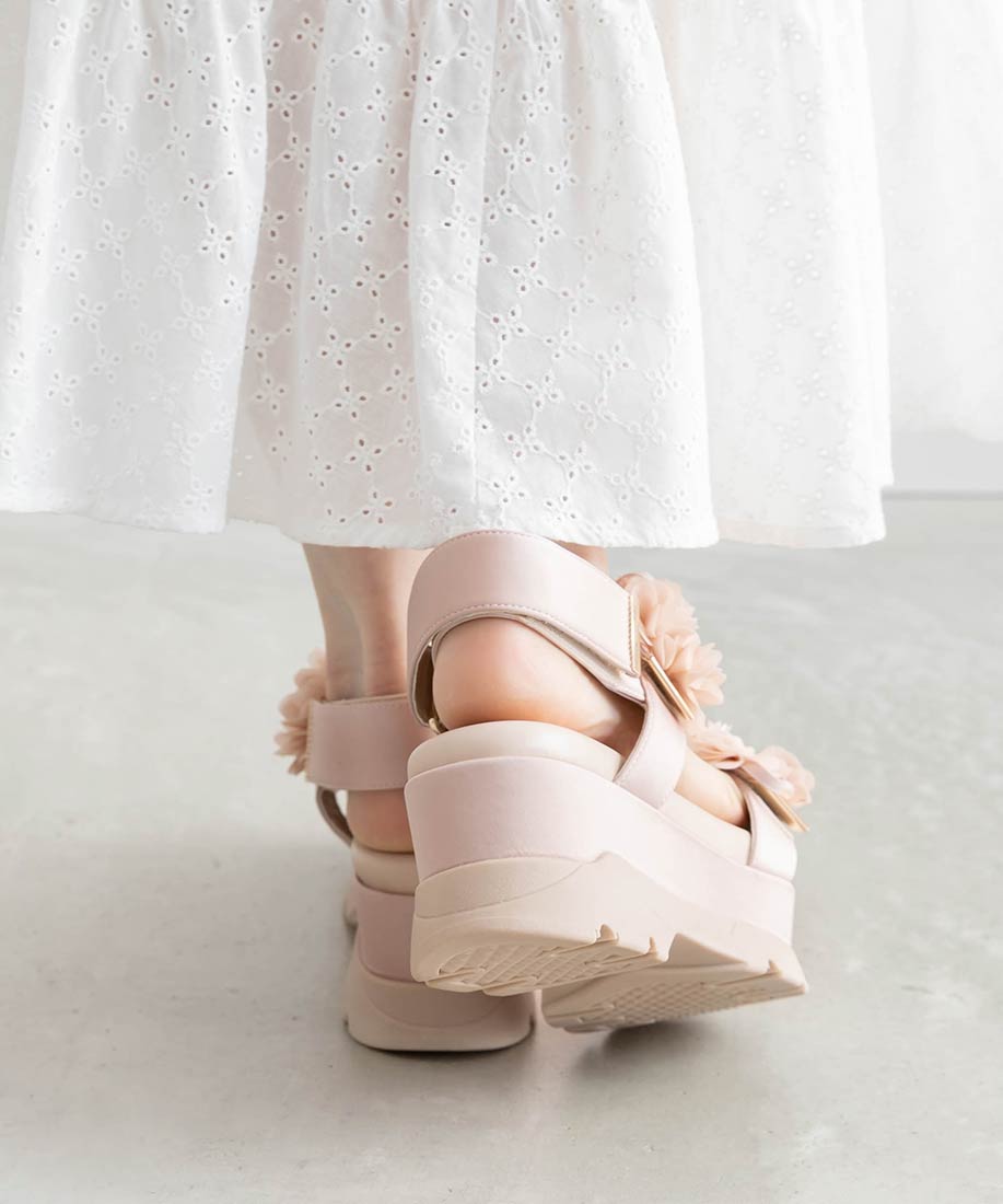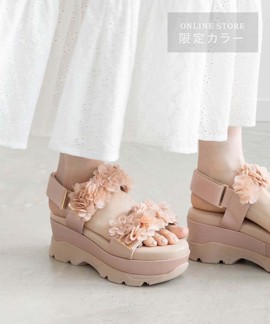 ボリューム感のあるアッパーにすっきりとしたシルエットの厚底ソールを合わせ、程よく甘さを抑えた大人可愛い一足に仕上げました。