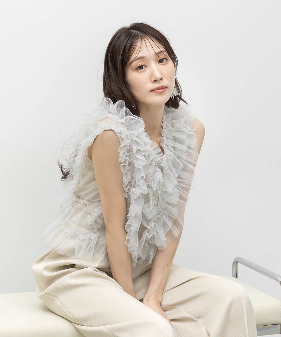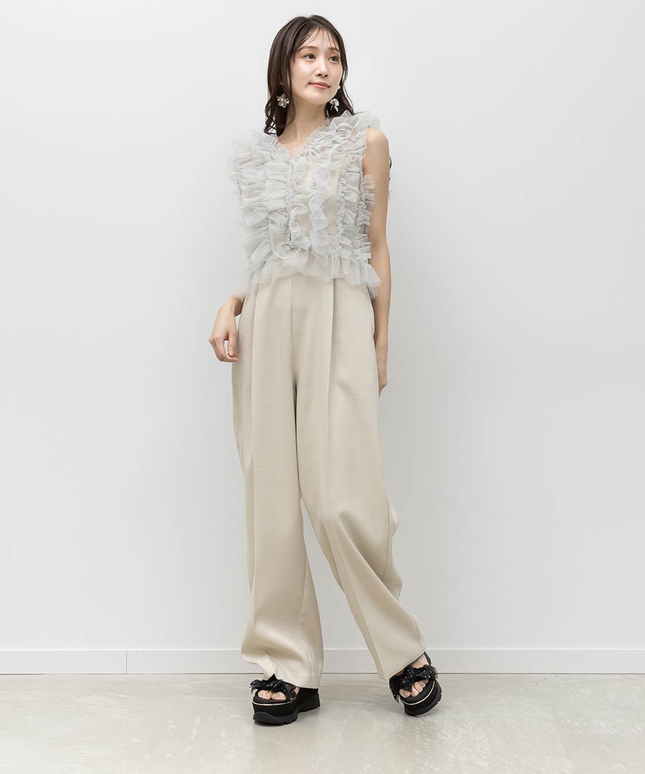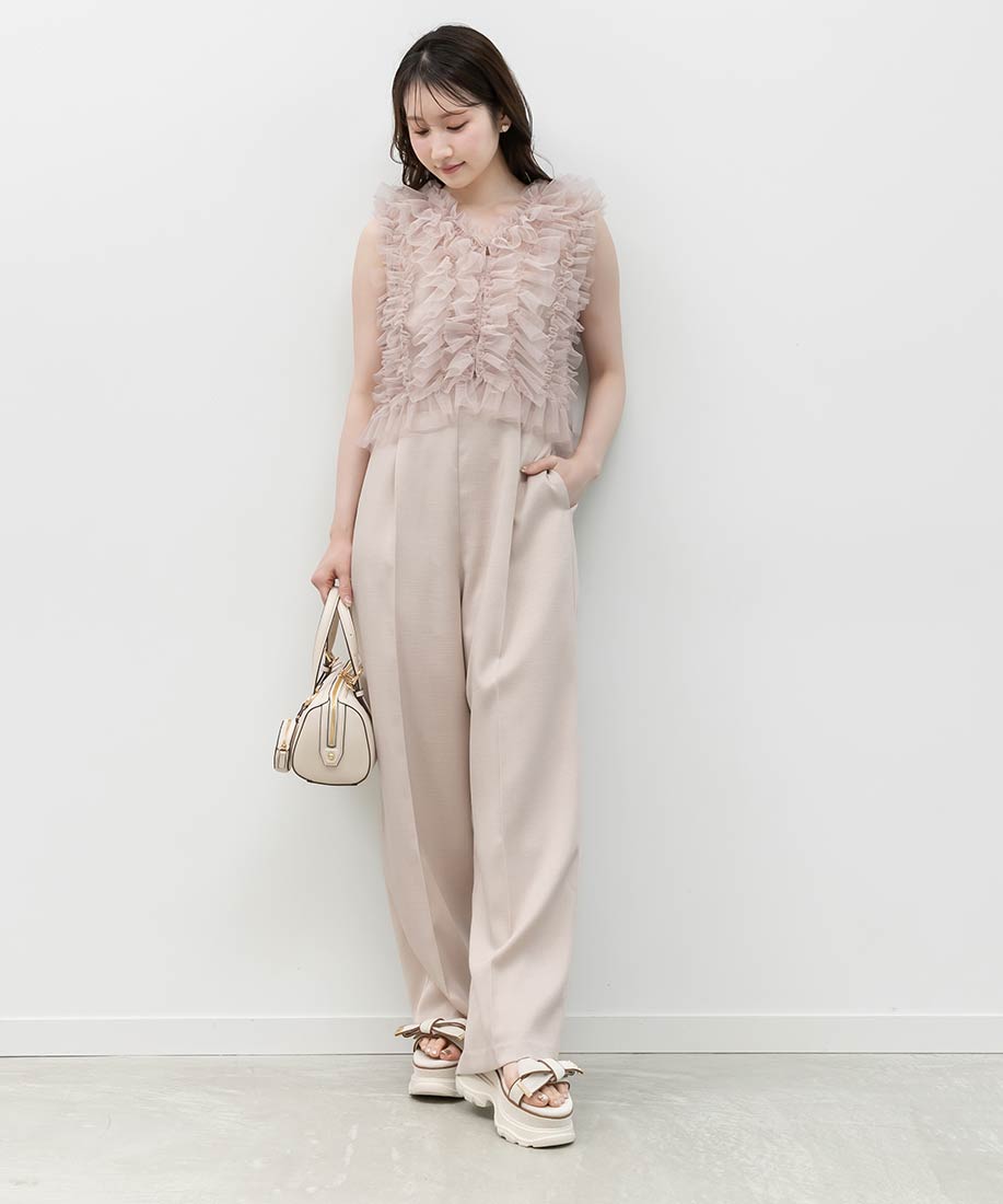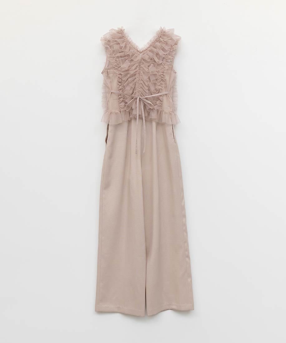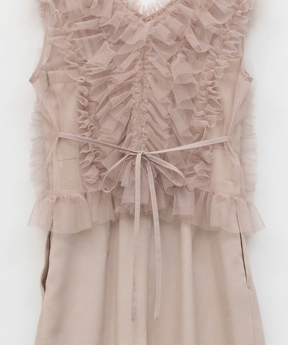 たっぷりとあしらわれたフリルがポイントのチュールブラウスと、ハイウエストでスタイルアップが叶うキャミロンパースがセットになったマルチウェイアイテム。