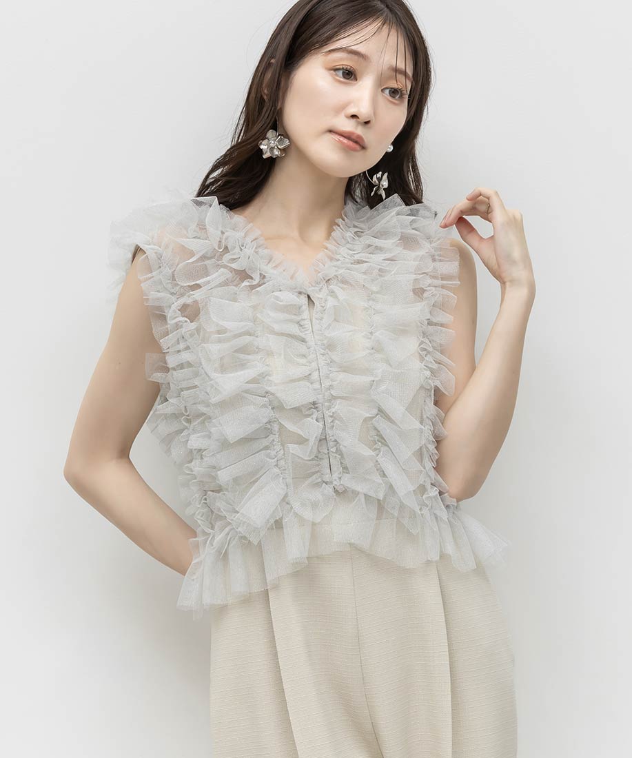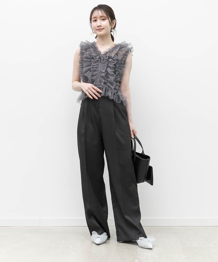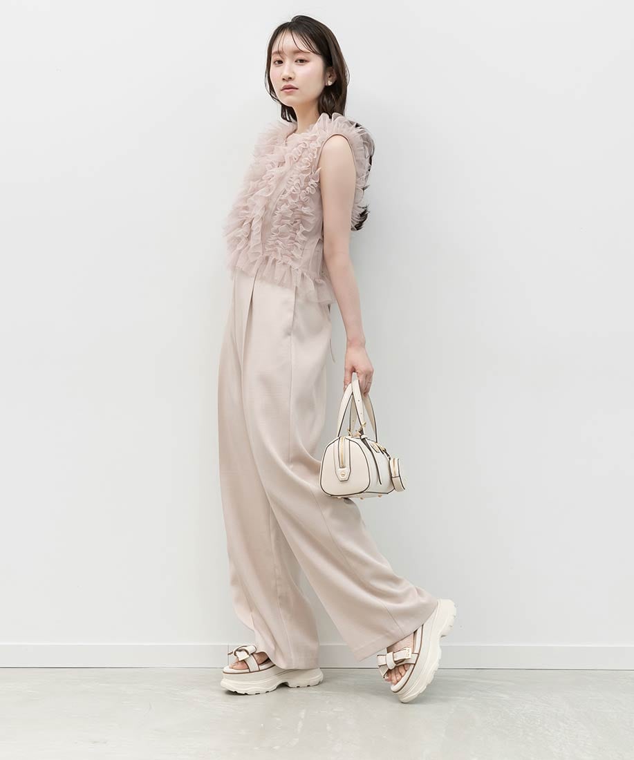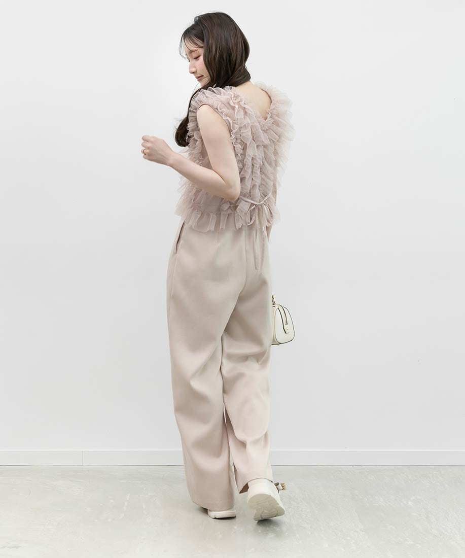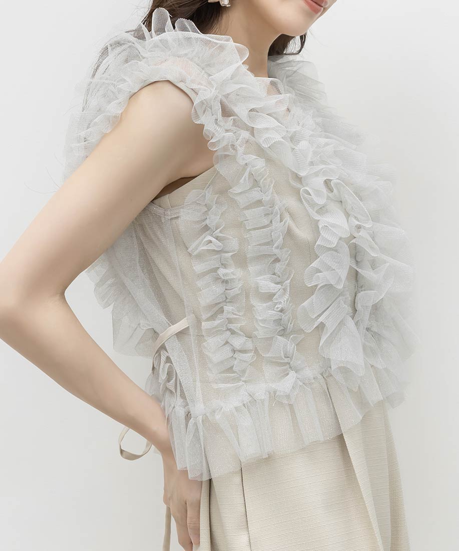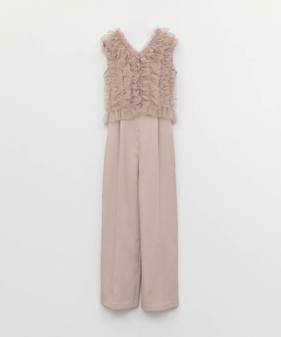 たっぷりとあしらわれたフリルがポイントのチュールブラウスと、ハイウエストでスタイルアップが叶うキャミロンパースがセットになったマルチウェイアイテム。