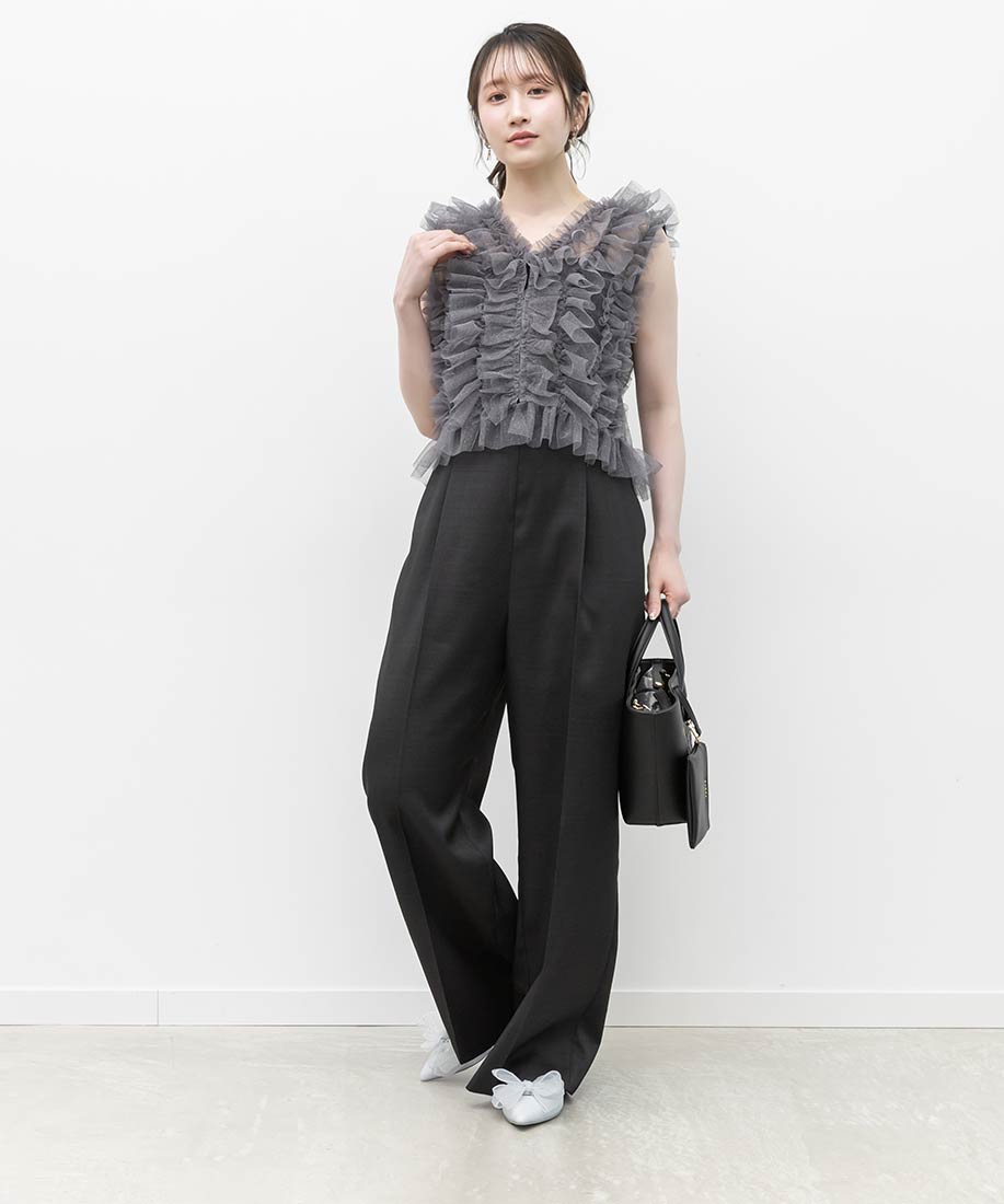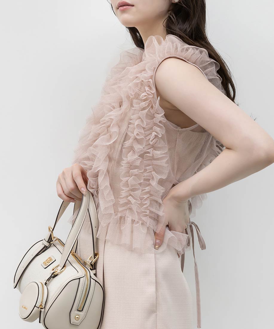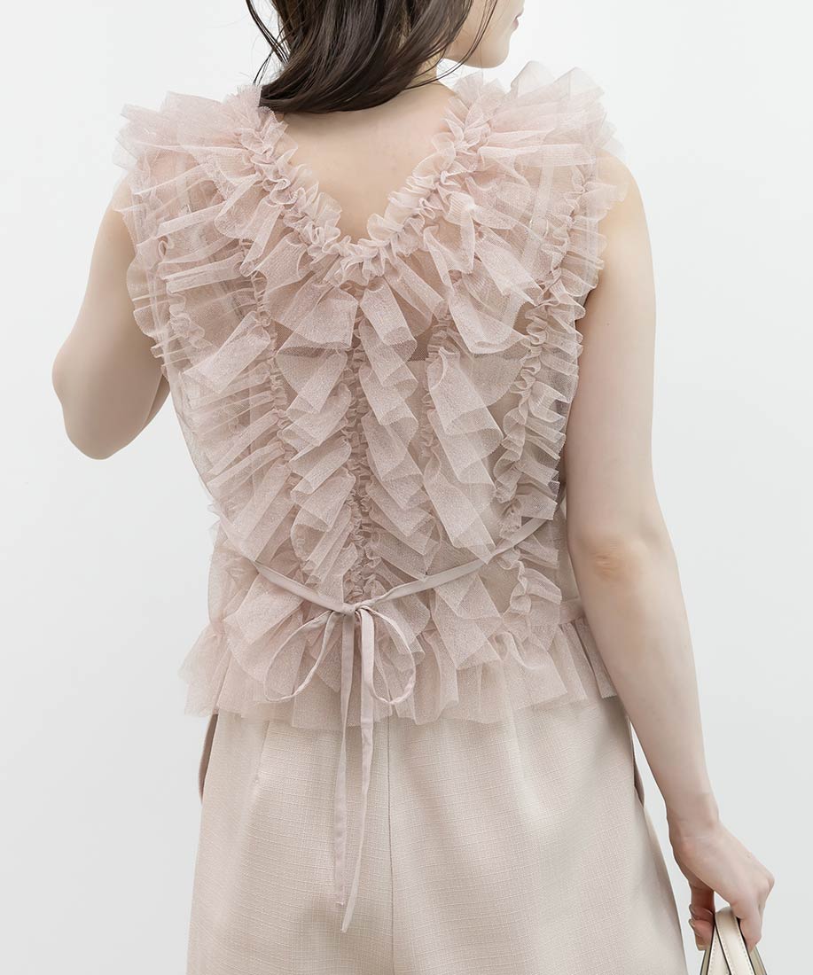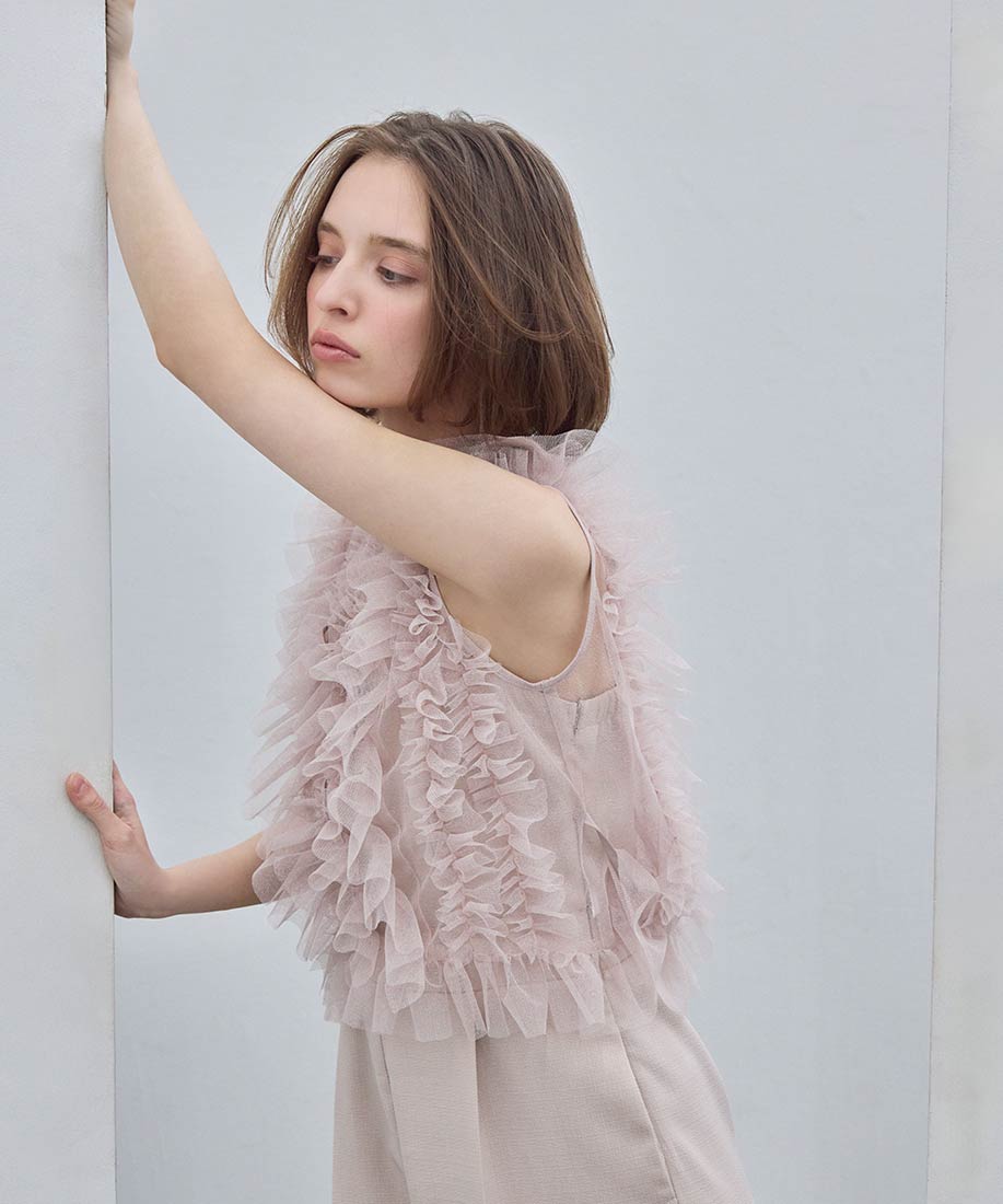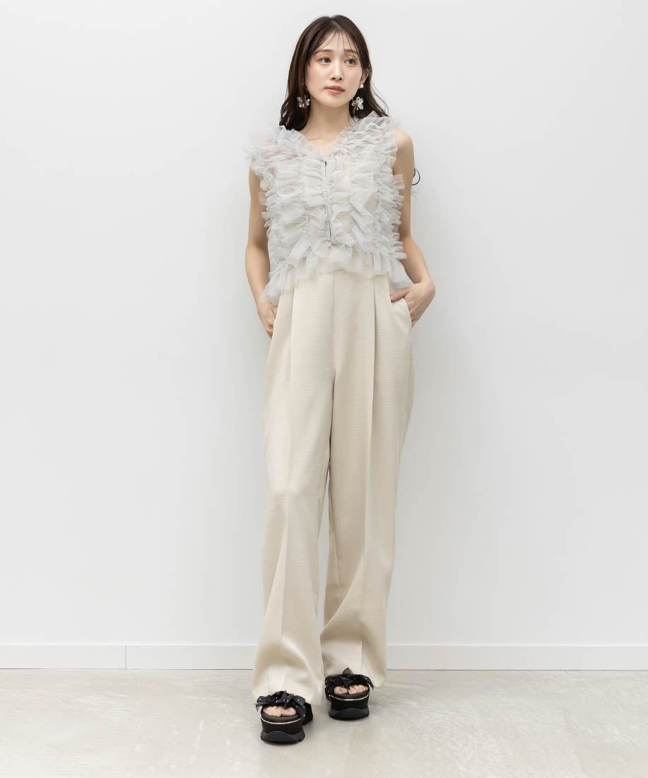 たっぷりとあしらわれたフリルがポイントのチュールブラウスと、ハイウエストでスタイルアップが叶うキャミロンパースがセットになったマルチウェイアイテム。