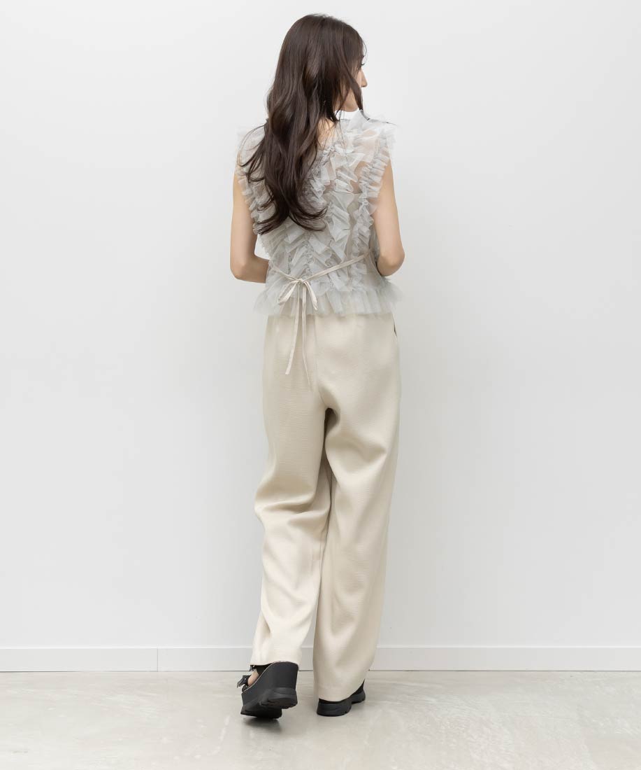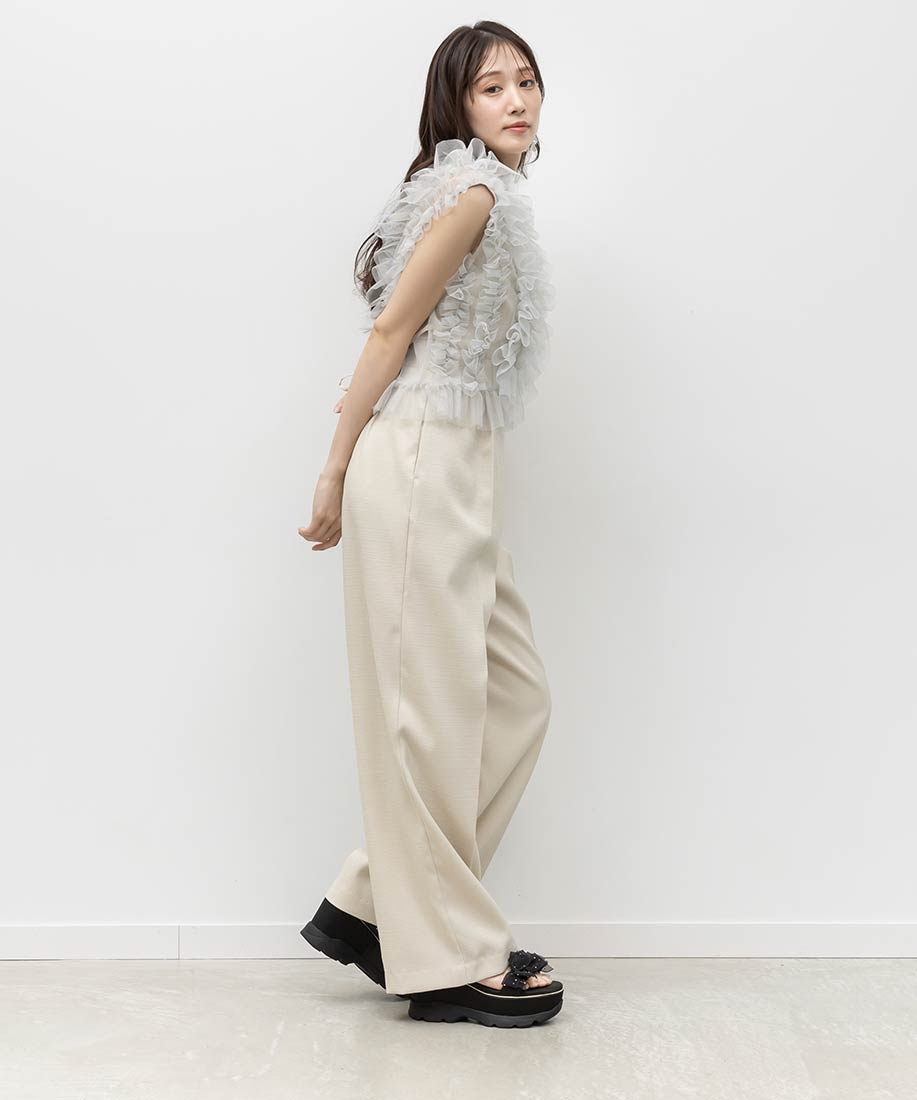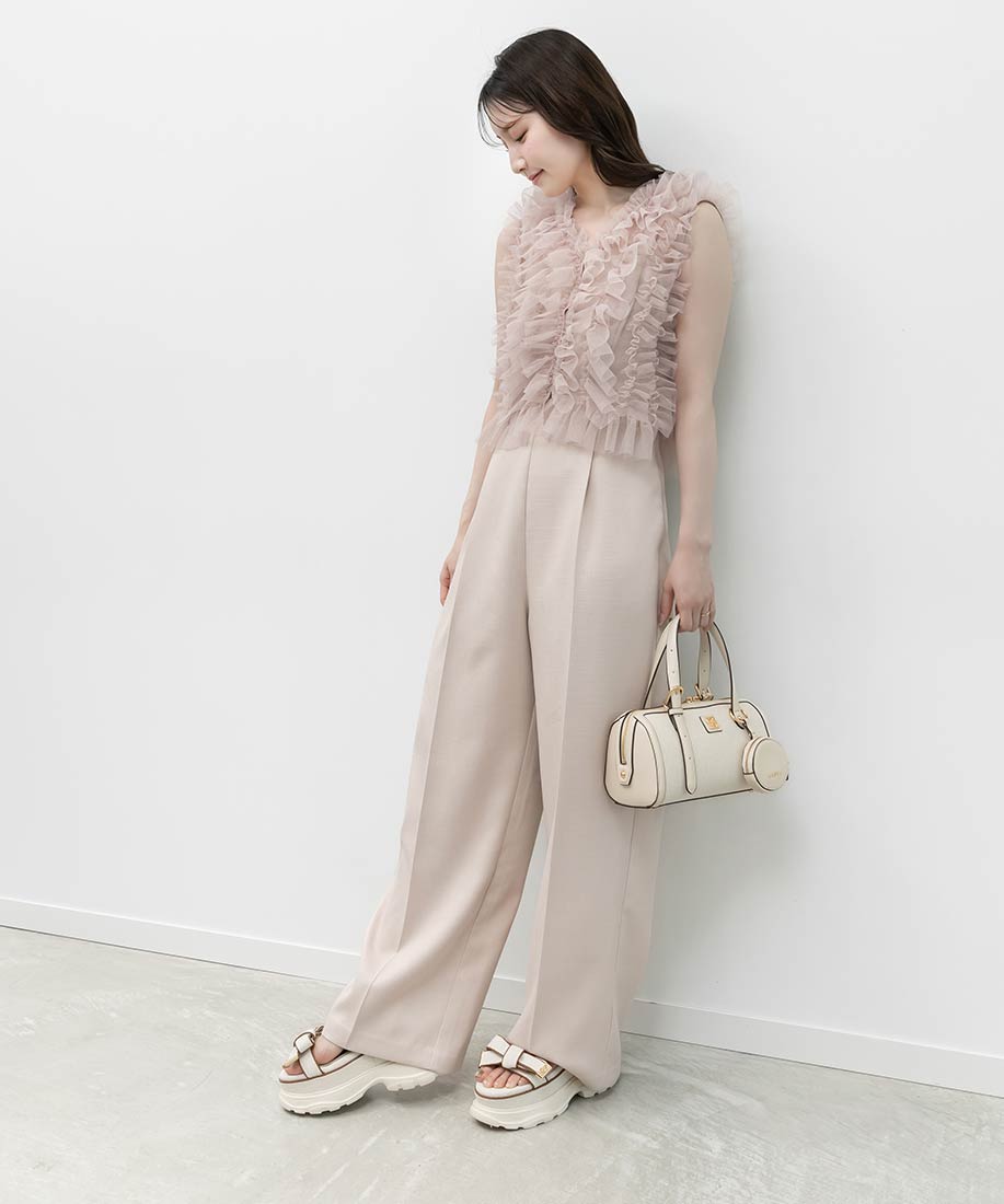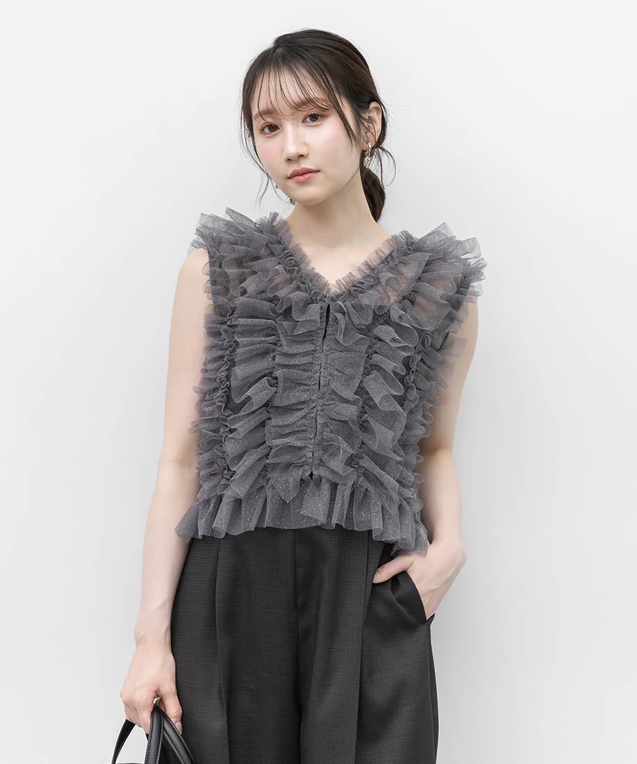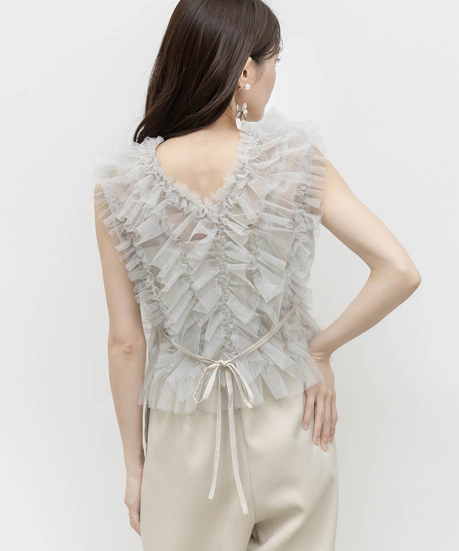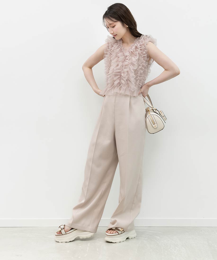 たっぷりとあしらわれたフリルがポイントのチュールブラウスと、ハイウエストでスタイルアップが叶うキャミロンパースがセットになったマルチウェイアイテム。