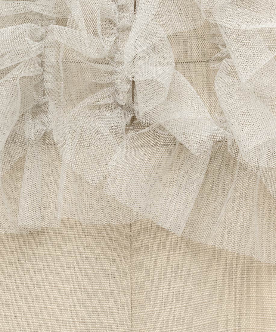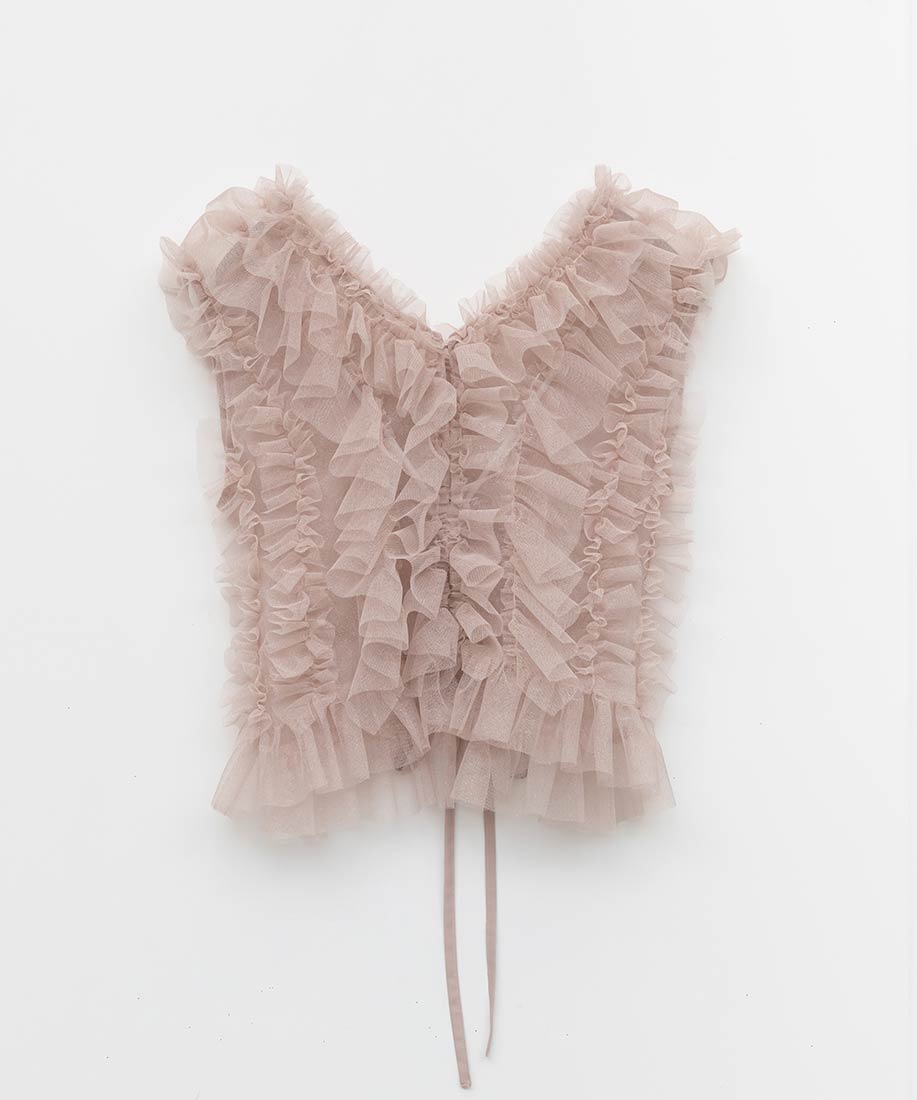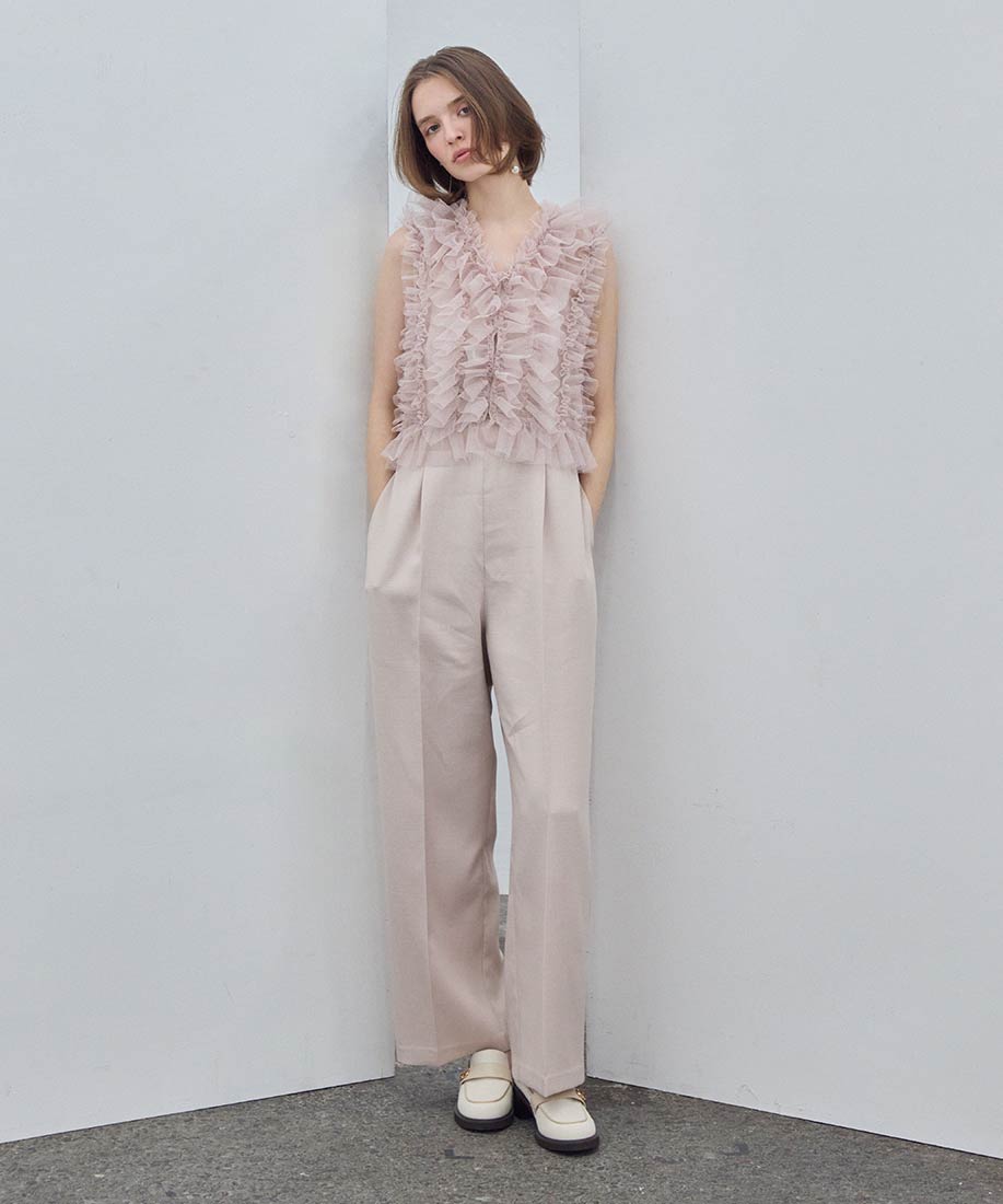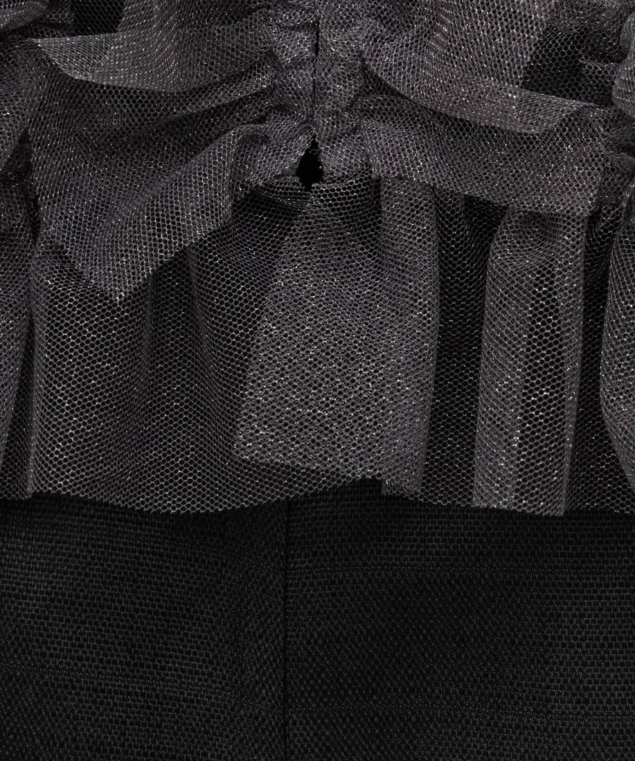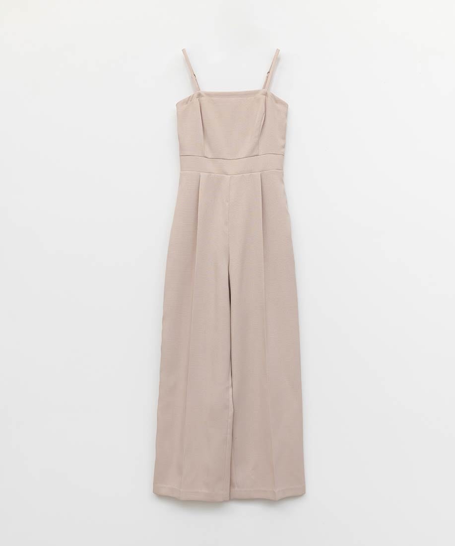 たっぷりとあしらわれたフリルがポイントのチュールブラウスと、ハイウエストでスタイルアップが叶うキャミロンパースがセットになったマルチウェイアイテム。