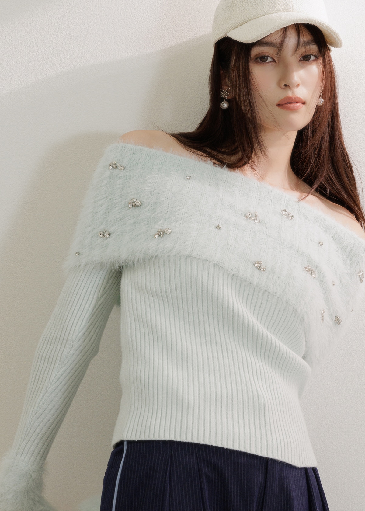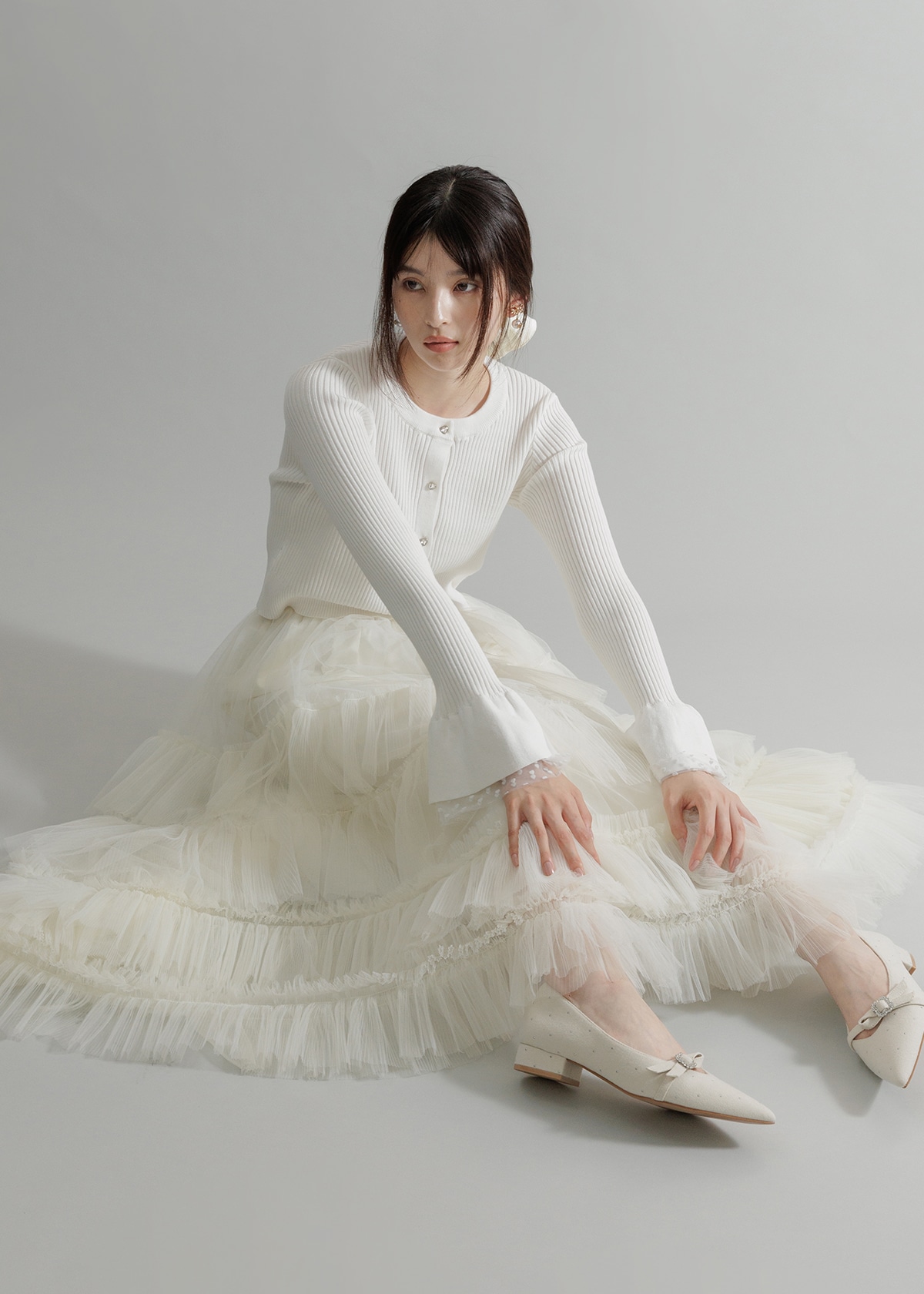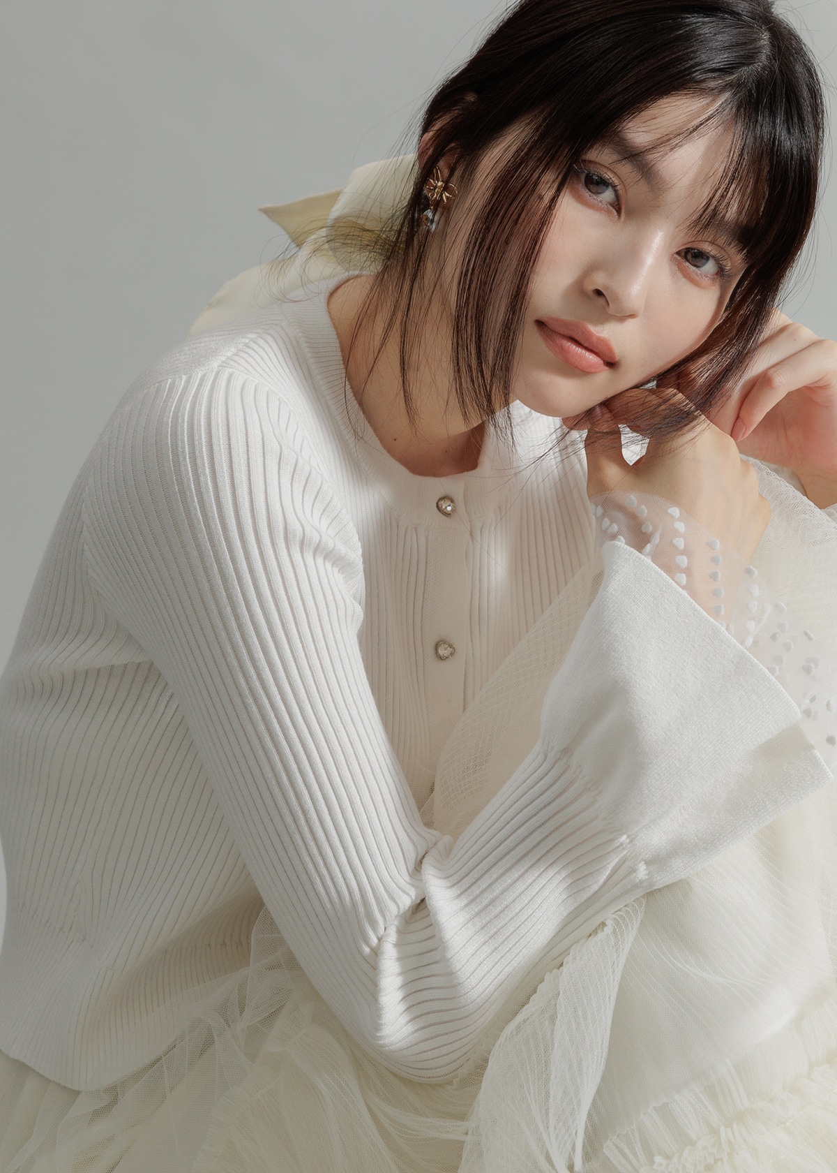 きらりと光るハート釦が華やかなアクセントとなる一枚。