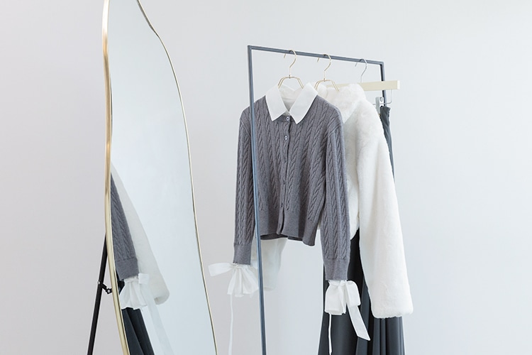 また上半身にポイントやボリュームを持ってくることで顔まわりの華やかさがアップし、目線を上に上げることができるので視覚効果でスタイルアップを狙って。