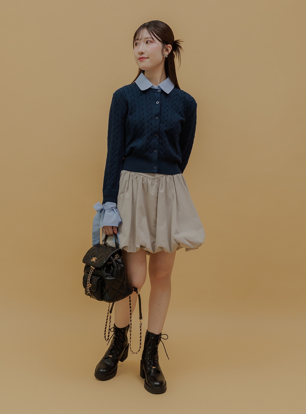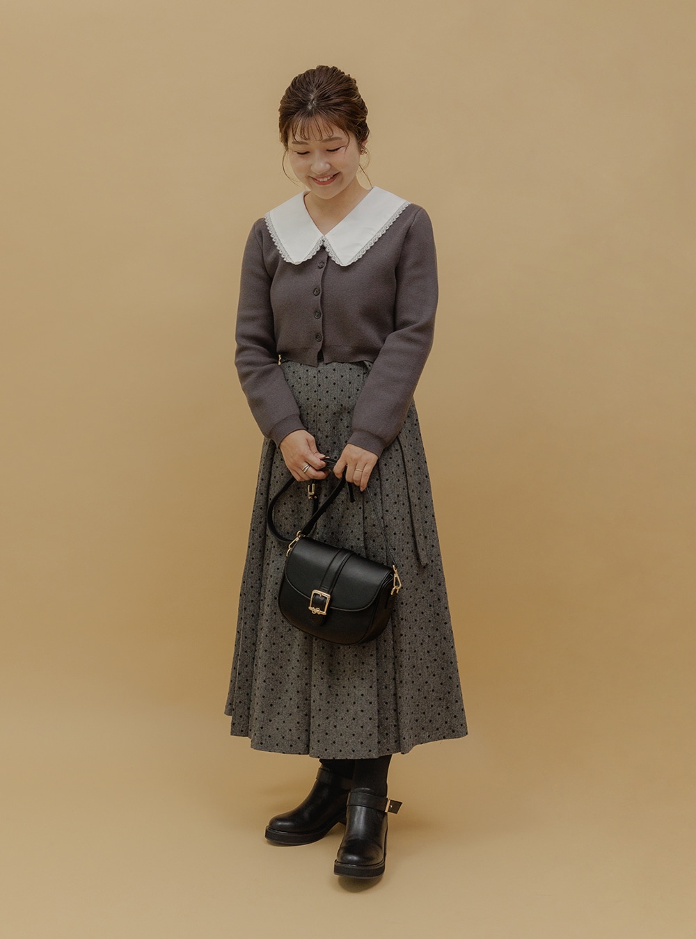 襟付きニットにバルーンスカートを合わせたクラシカルなコーデ。