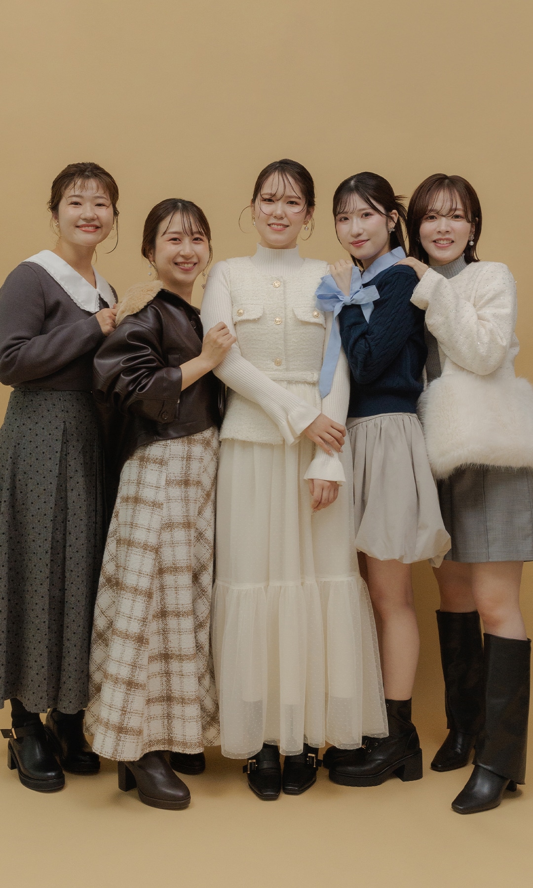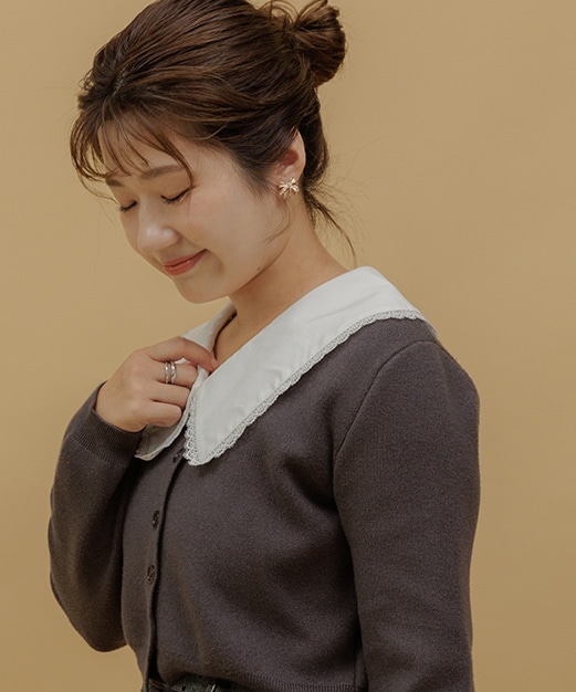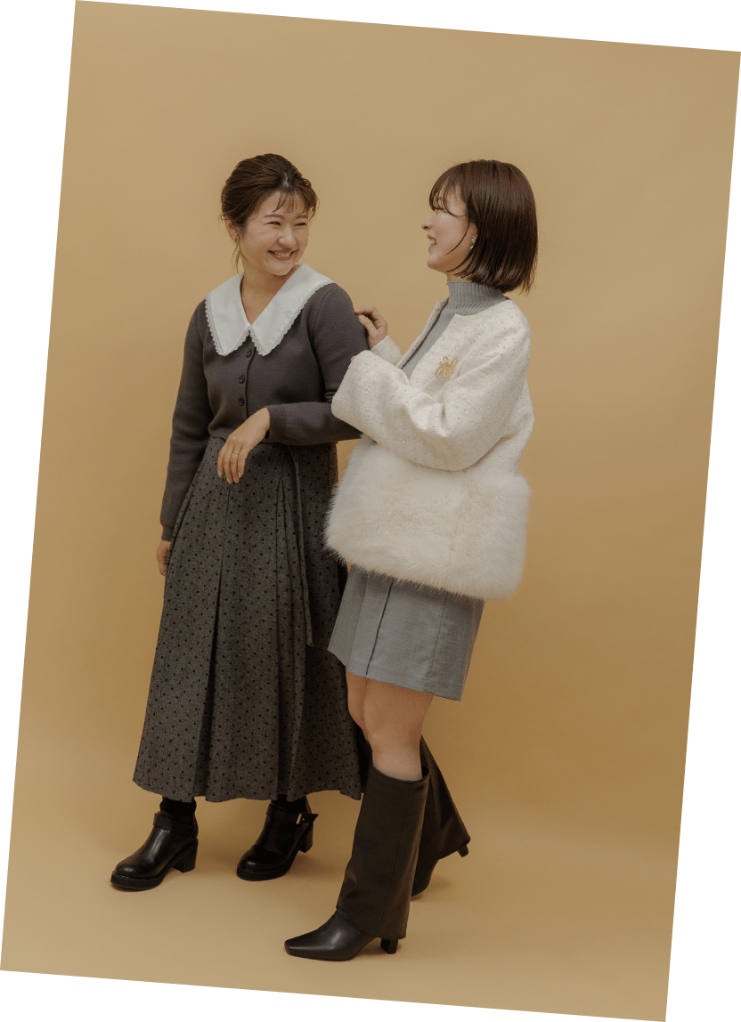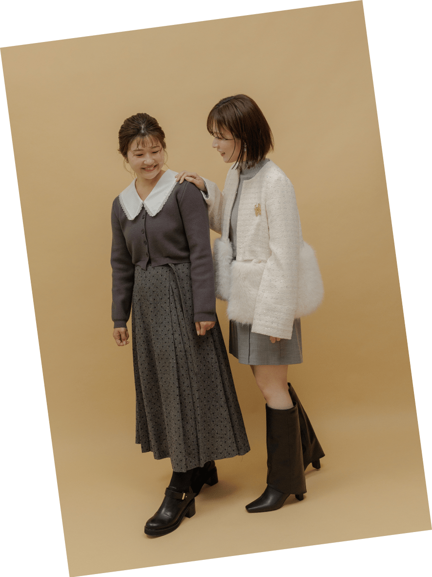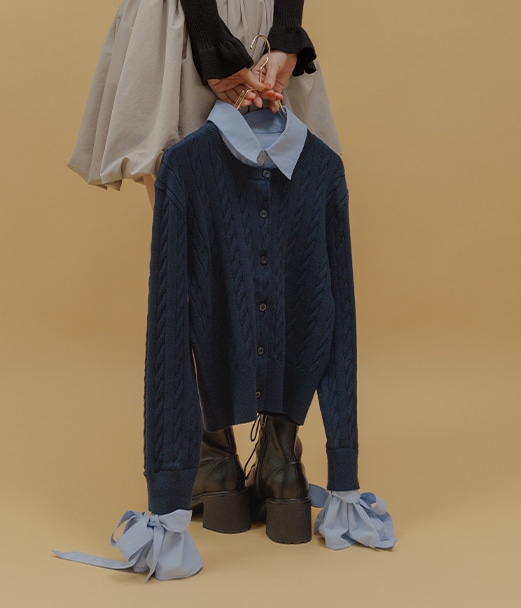 遊び心のある袖のリボンで甘さは残しつつ、足元には辛さのあるレースアップブーツを取り入れることで、ミニスカートでも幼さを感じさせないスタイリングに仕上げました。