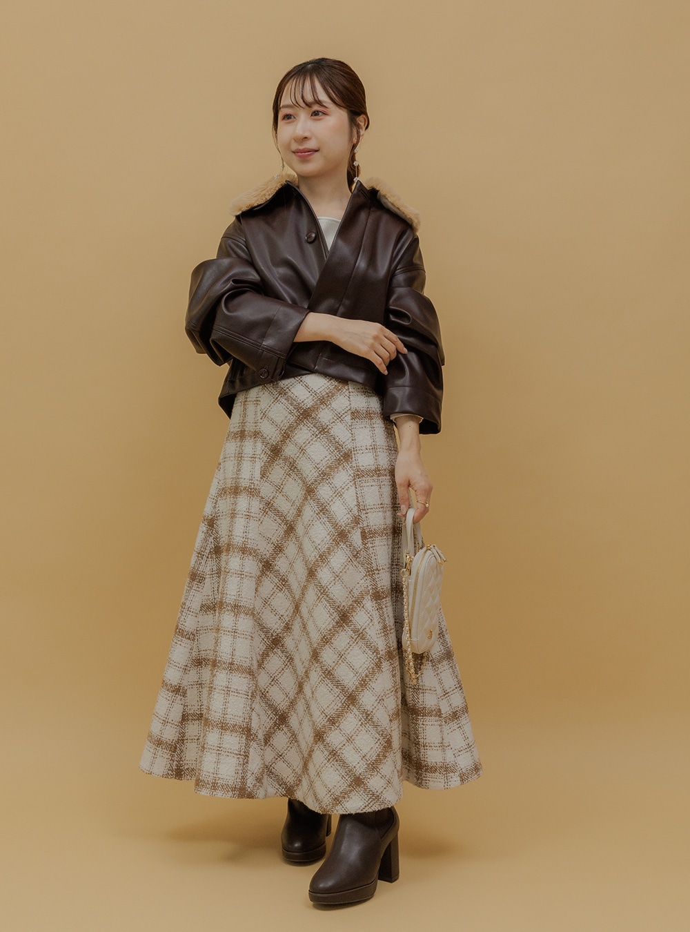 ロングスカートにコンパクトなアウターとヒール高めのブーツを合わせて、全体のバランスを意識しました。