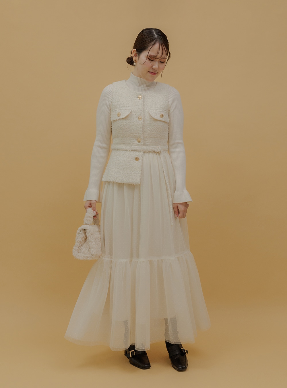 今季トレンドのミドル丈のタックスカートを合わせるだけで様になるスタイリングが完成します。