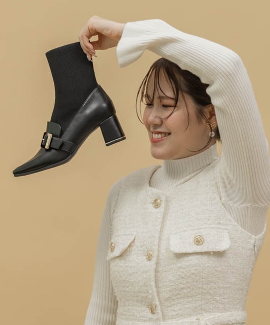 コンパクトなニットには足元に厚みのあるソックスブーツを合わせることでバランスが◎