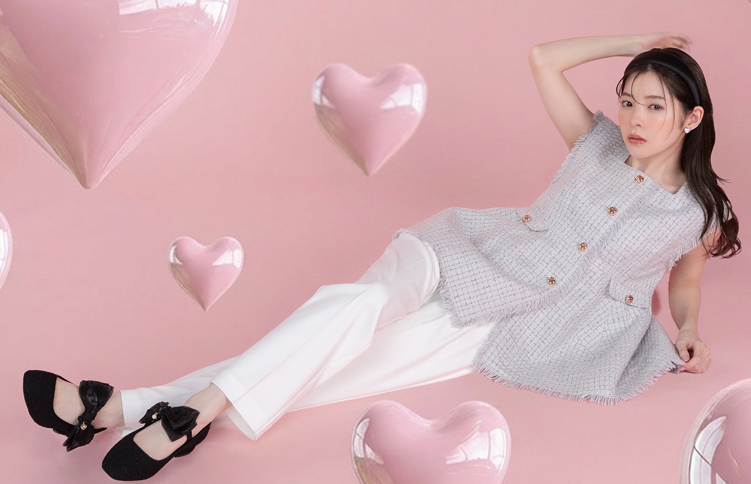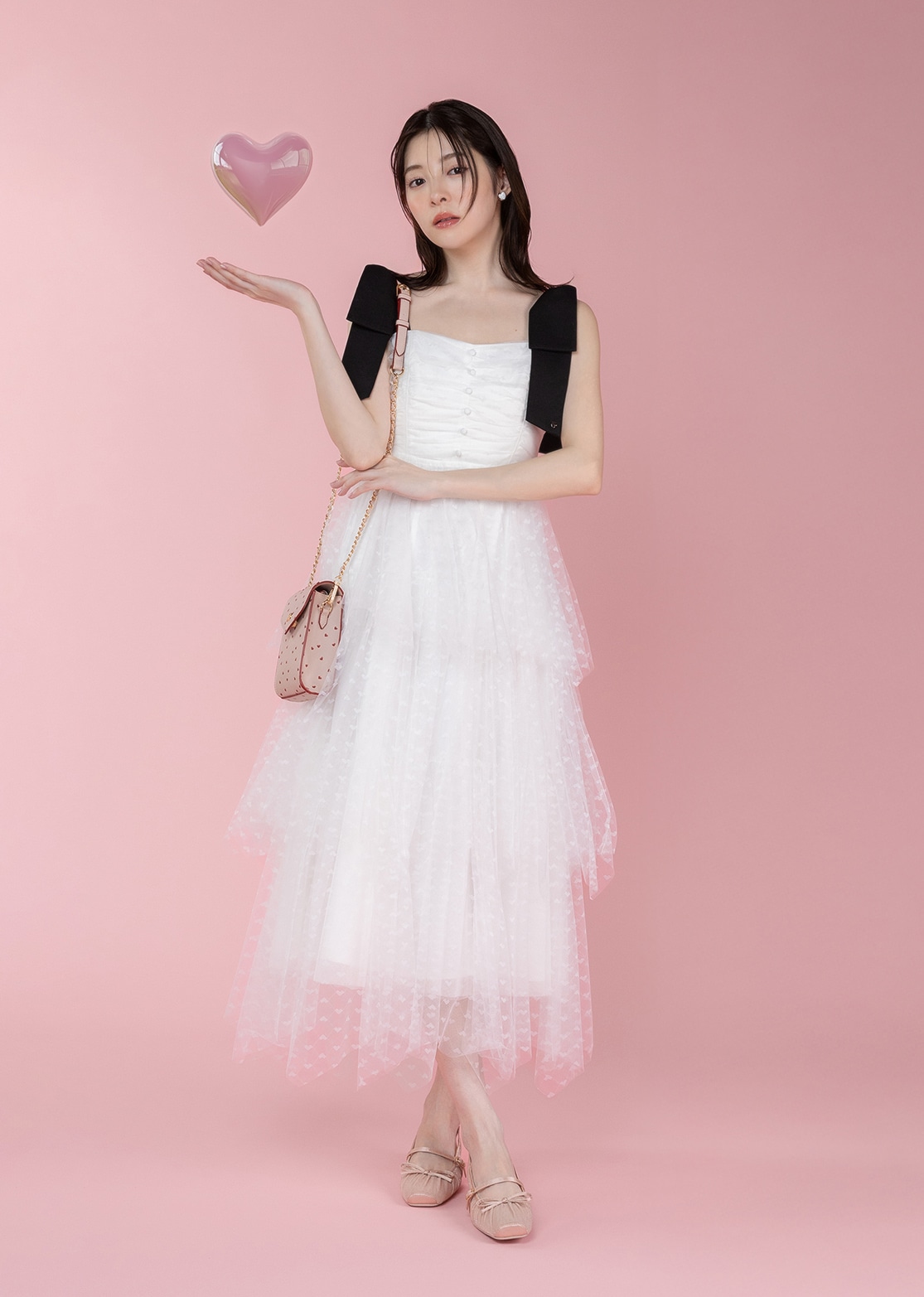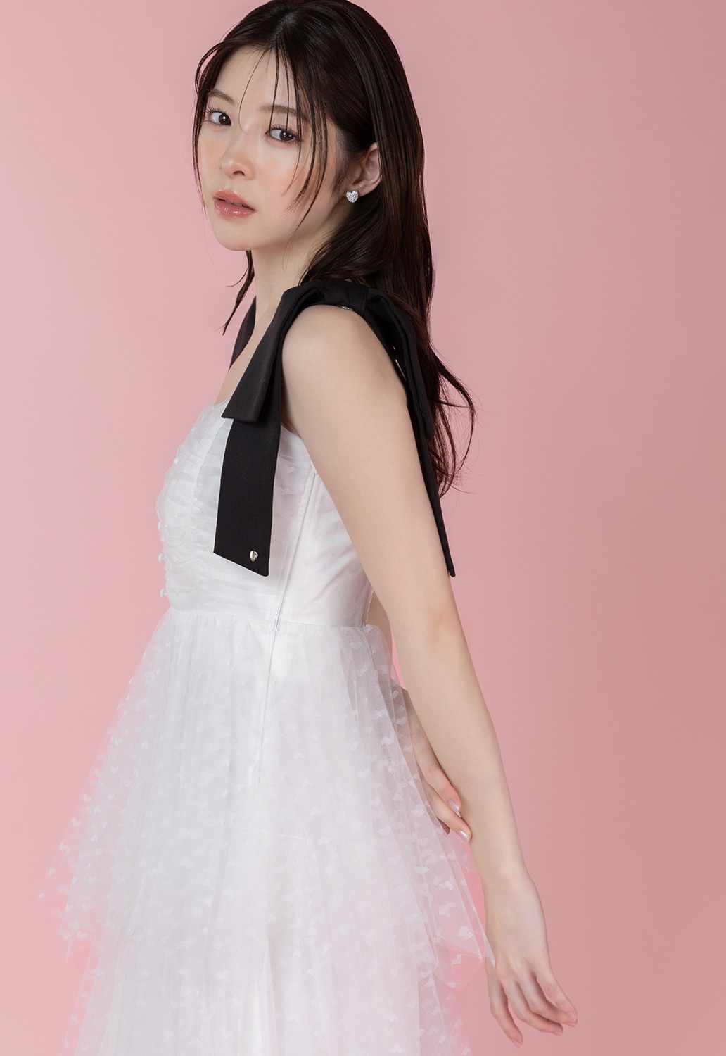 Dress 22,000yen/ Shoes 8,910yen Shoulder bag 8,910yen/ pierced earrings 2,200yen